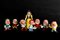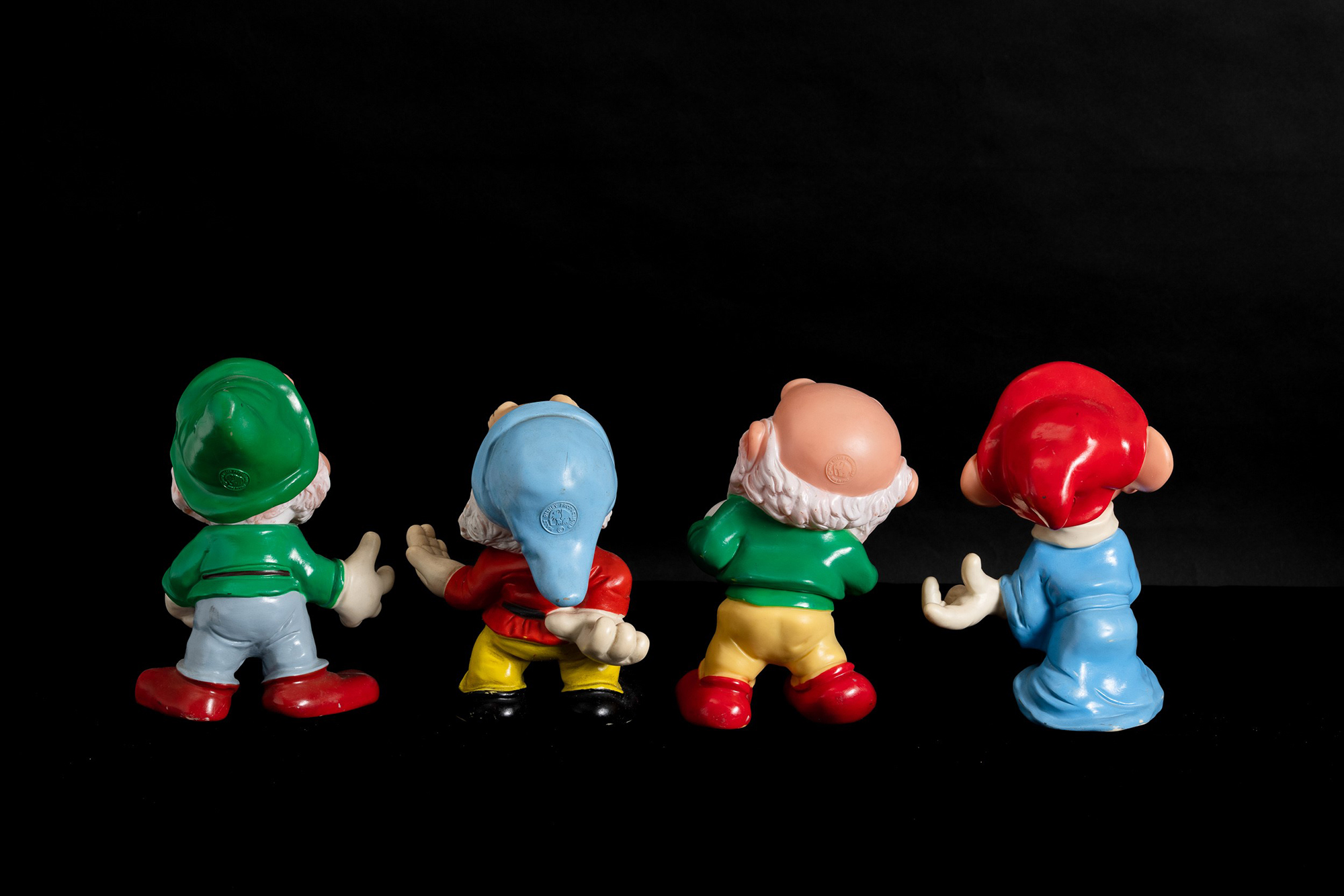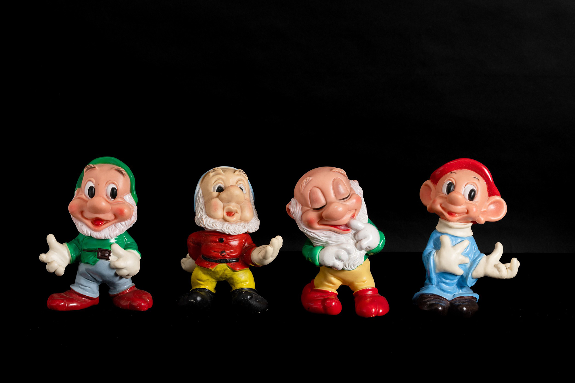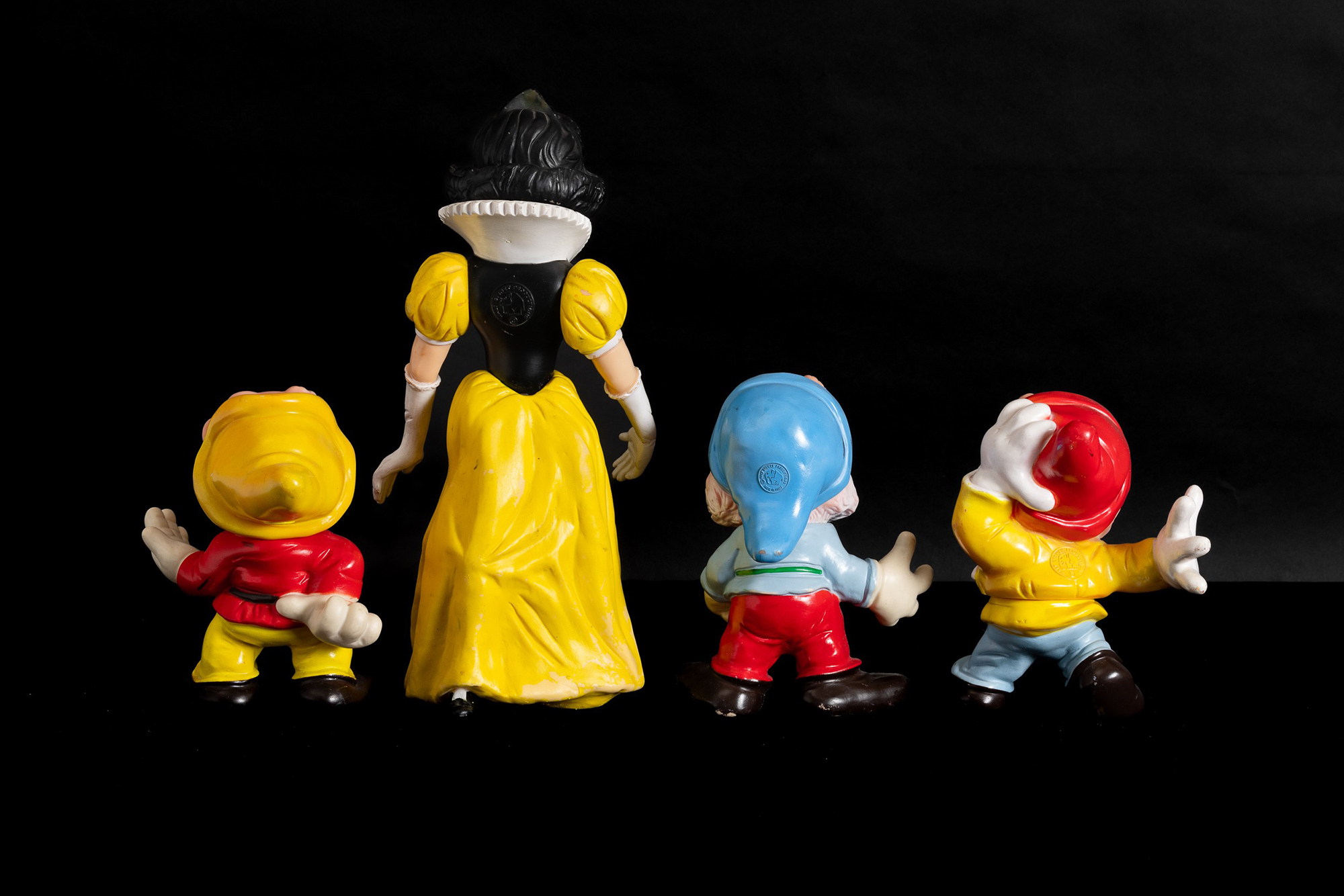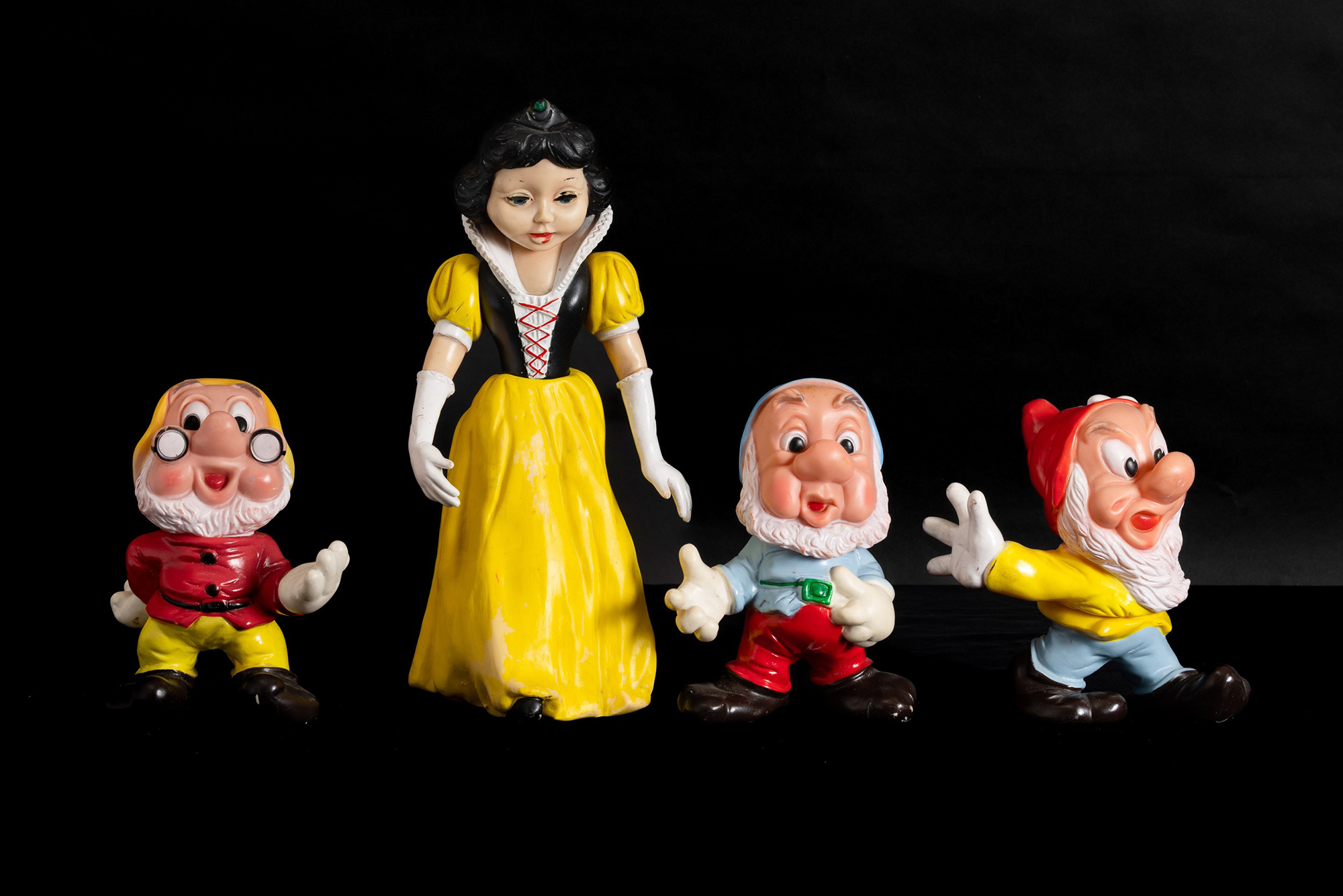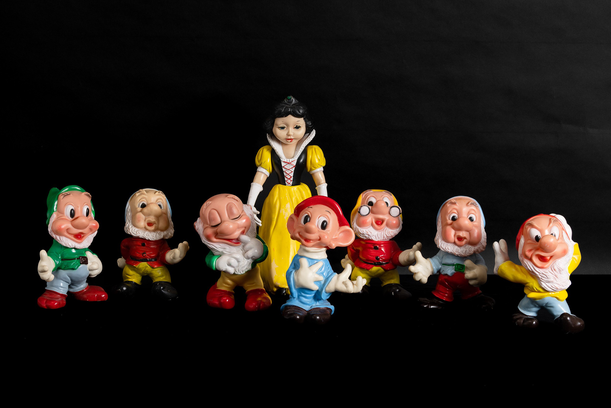 Pupazzi in gomma, marchiati Ledra, 1970 ca. Cm h 23 i Sette Nani e cm h 40 Biancaneve.