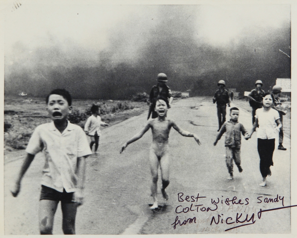 signed and dedicated on the front (The inscription reads: "Best Wishes Sandy Colton/From Nick Ut.")