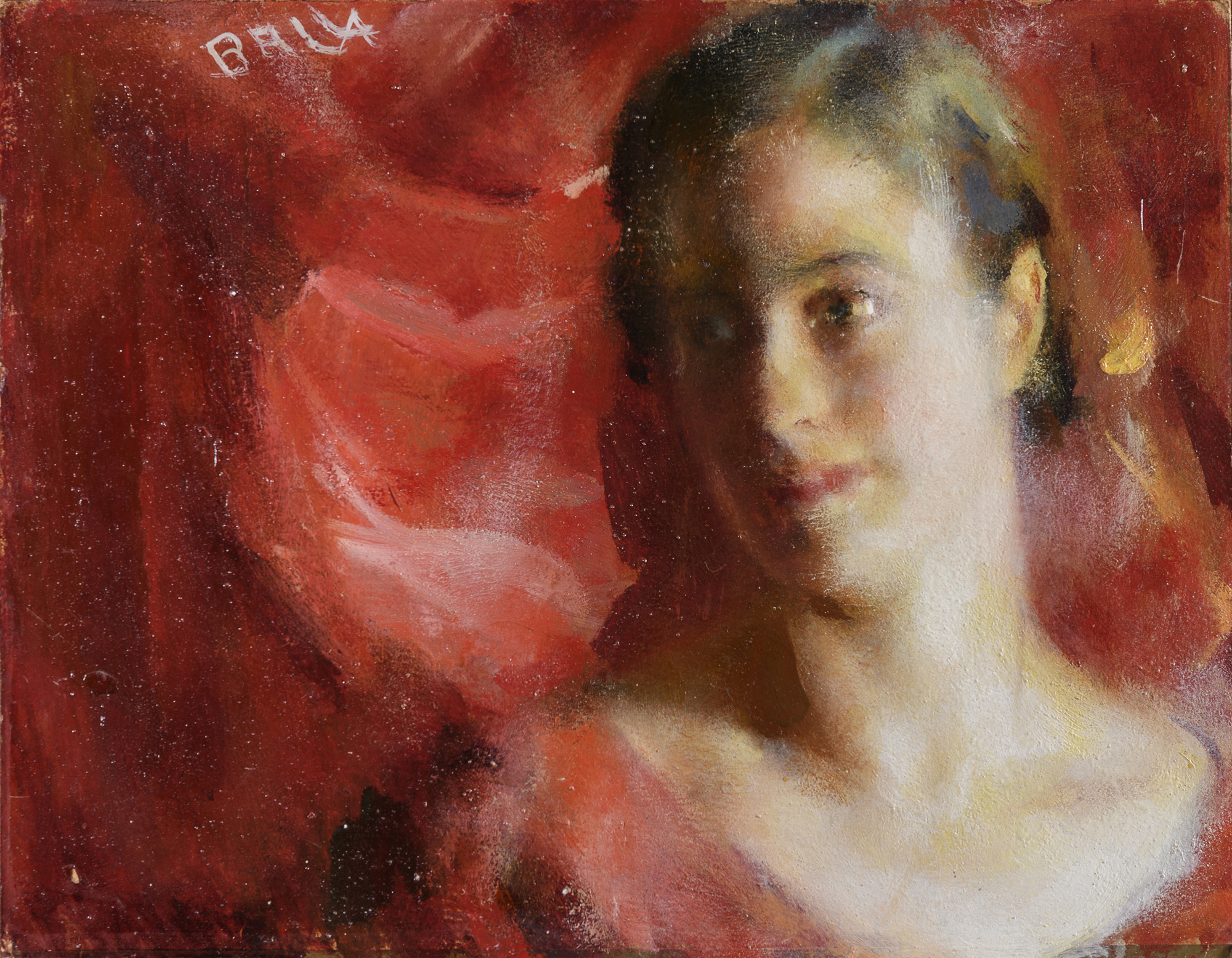 In una fiammata alta e impetuosa di veli rossi, Giacomo Balla in questa opera ritrae la primogenita Luce con lo sguardo rivolto verso sinistra. Il rosso intenso ora viene come spalmato senza risparmio, quasi fosse un fuoco ravvivato da più punti luci, arrivando ad esporre la modella, in questo caso la figlia Luce, ai raggi di una intensa sorgente di luce artificiale. Sul retro del compensato, si legge la dedica all’amico Alberici. Dalle memorie di Elica Balla: 'Mio padre aveva conosciuto, probabilmente alle ultime esposizioni, il Signor Alberici il quale voleva aprire una Galleria d’arte e voleva inaugurarla con una mostra di Balla che tanto ammirava. La Galleria era situata in Via di Santa Susanna' (vol. II, pp. 358 - 359). Il 22 giugno 1930 viene inaugurata la Galleria: in catalogo la presentazione di Marinetti considera 'il pittore Giacomo Balla come il tipico genio torinese. A 25 anni, stabilitosi a Roma, non subisce l’atmosfera languida e le nostalgiche ceneri gloriose. [..] Balla, massimo pittore d’oggi, rassomiglia forse ad una nuvola temporalesca irta di folgori o meglio ad un ciclone che da l’assalto ai ruderi. Più volte m’apparve come uno stregone negro di Rio de Janeiro educatore di pappagalli policromi'