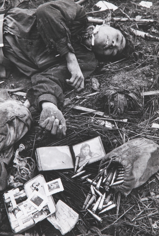scritta a matita sul retro: “Il corpo di un soldato nordviet. Accanto a lui ciò che rimane dei suoi effetti personali”.