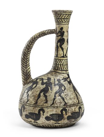 a sagoma di anfora, modellato a mano e smaltato con decoro a figure di danzatori e uccelli.