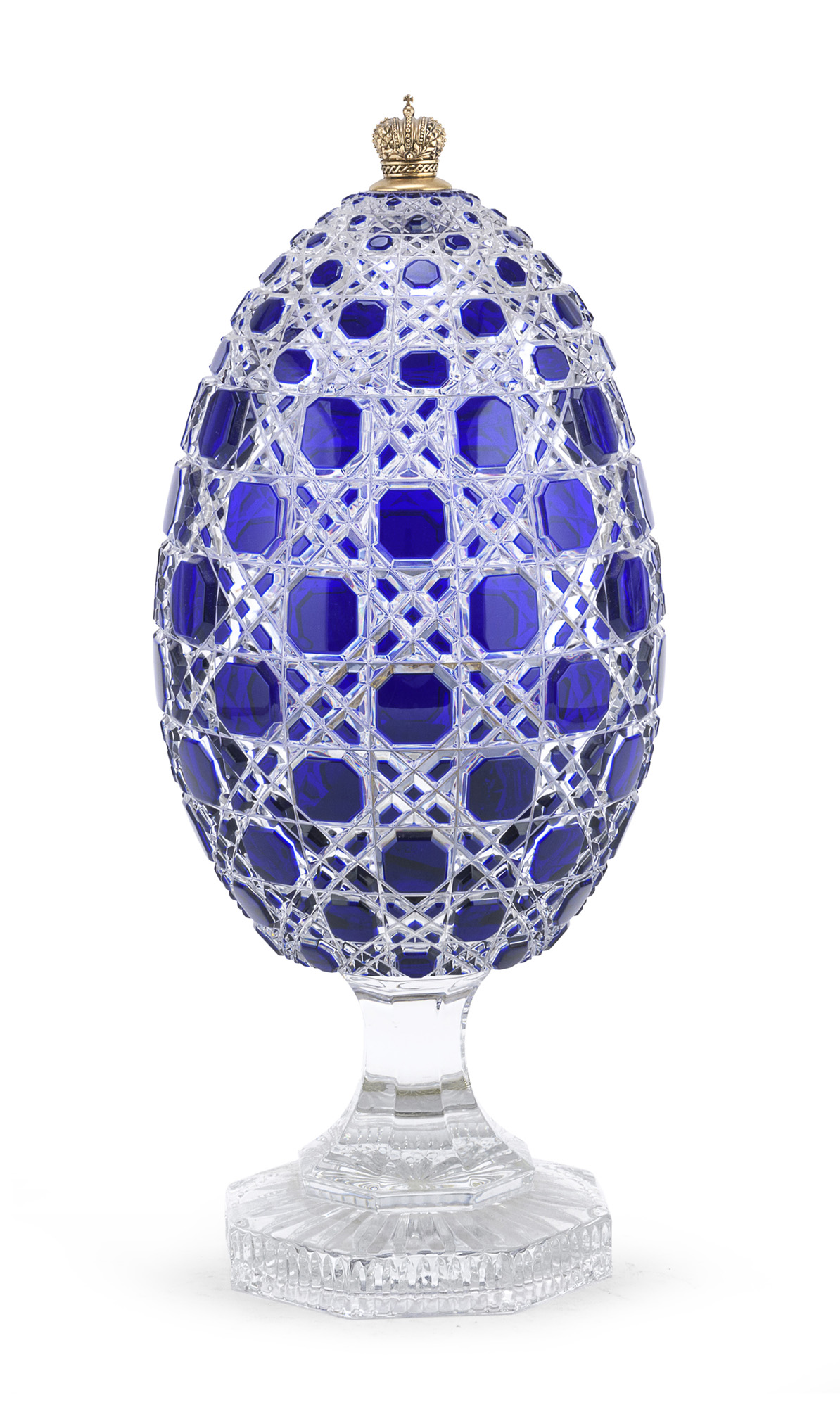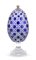 a forma di uovo, a fondo trasparente e blu tagliato a punte di diamante. Tappo con coroncina in ottone sulla sommità.