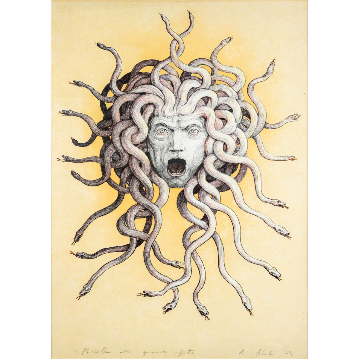 "Senza titolo", tecnica mista su carta, firmata con dedica e datata in basso, entro cornice