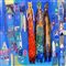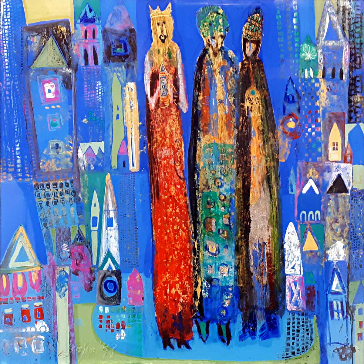 "Re Magi", 1998, pittura su cristallo di Murano, firmata e datata in basso a sinistra, entro cornice in rame sbalzato realizzata dall'autore