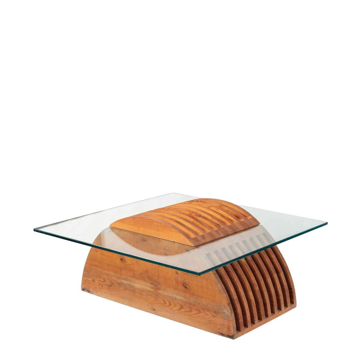 tavolino scultura con piano in cristallo molato, firma e marchio della produzione