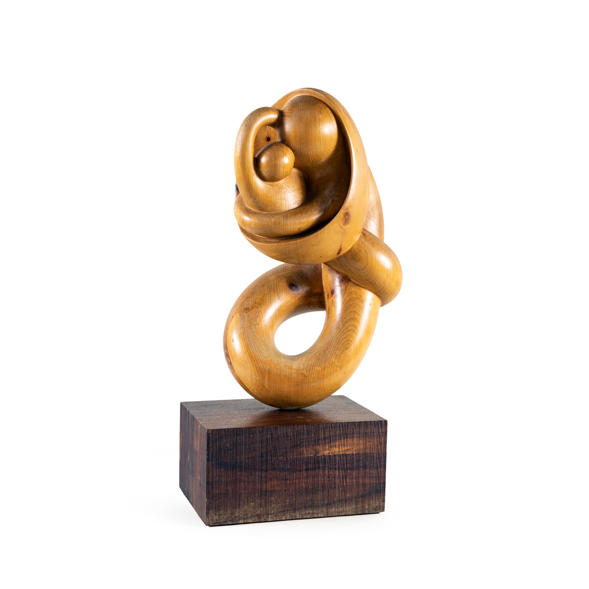 "Maternità", 1987, scultura in legno, firmata e datata, poggiante su base squadrata