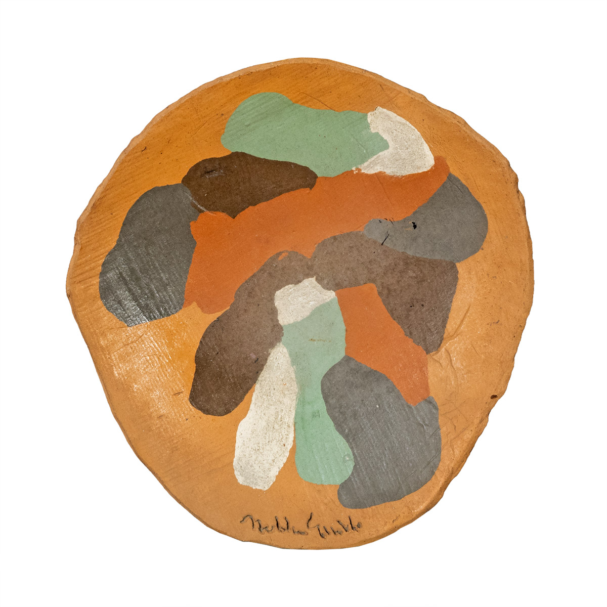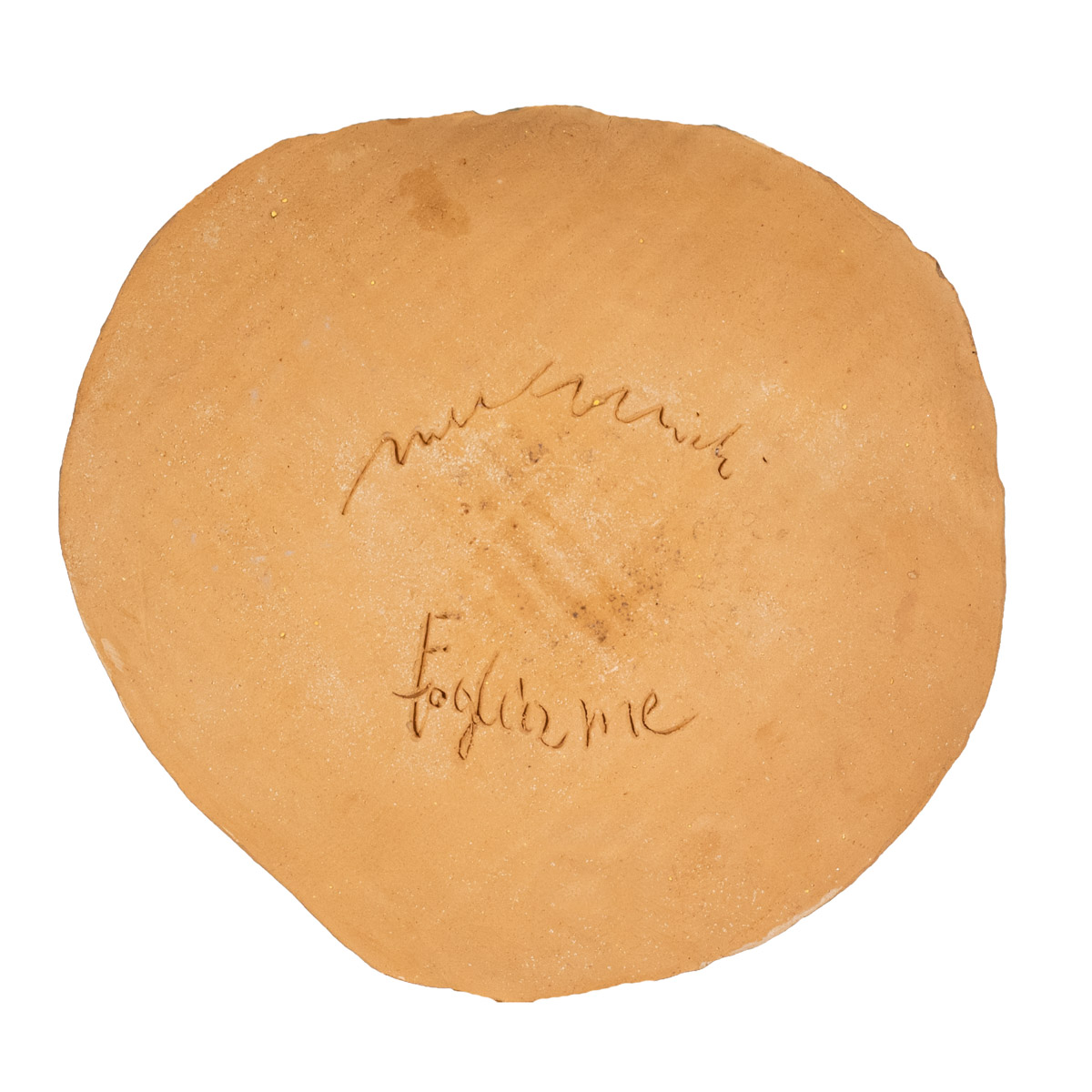 "Fogliame", scultura in terracotta dipinta, firmata in basso a destra, titolata e firmata sul retro