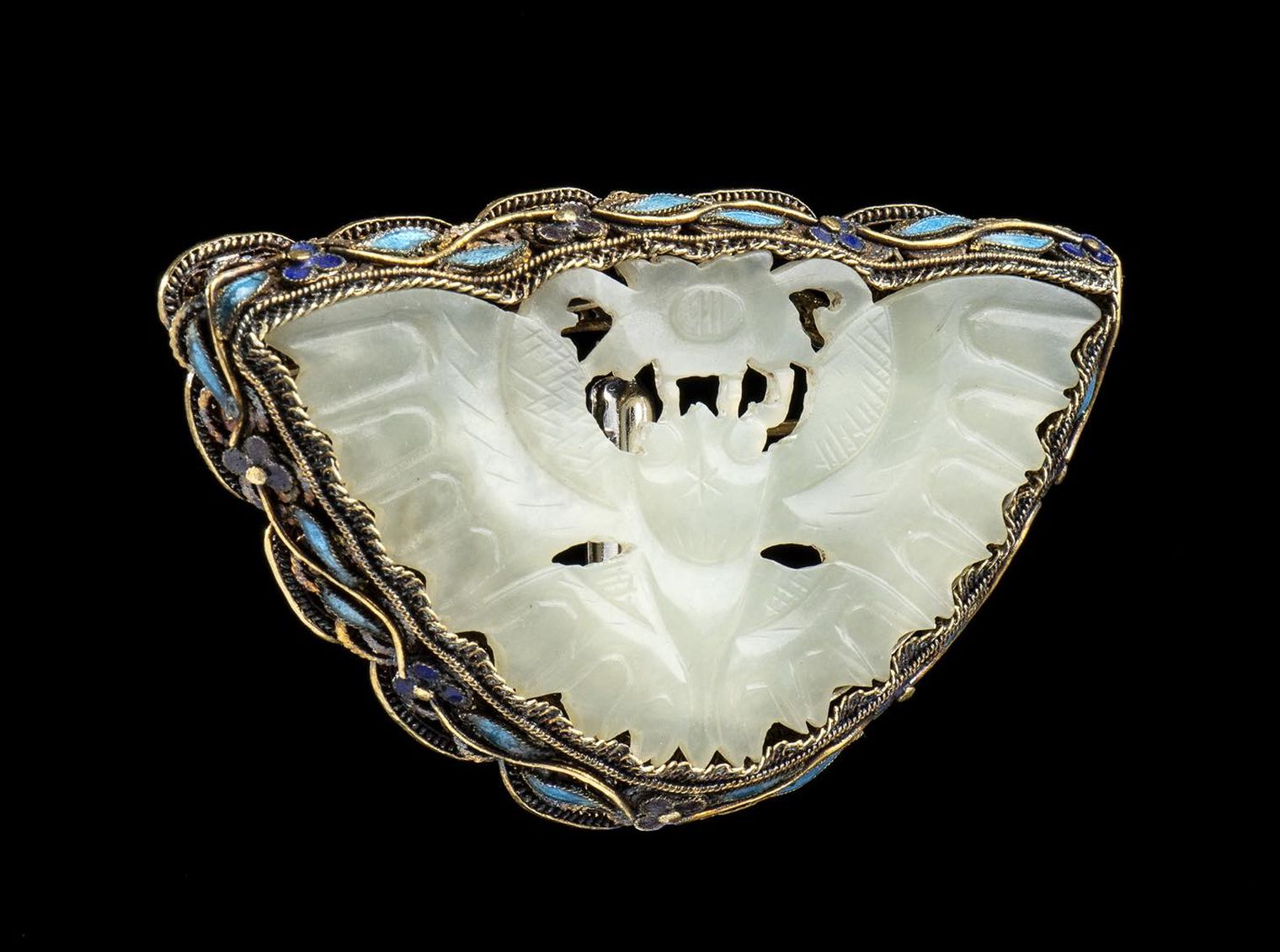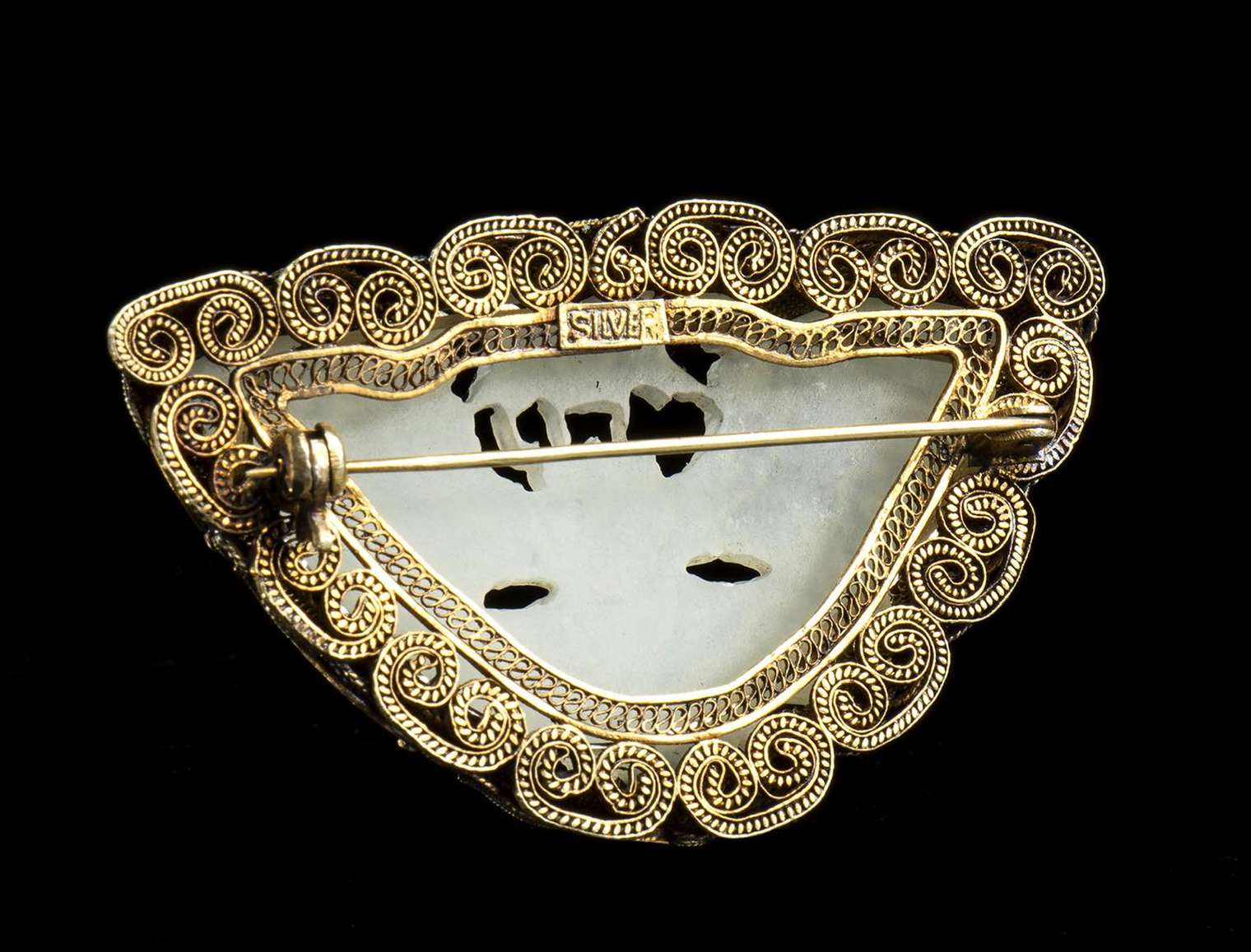 SPILLA IN METALLO DORATO E SMALTATO CON INSERTO IN GIADA Cina, prima metà del XX secolo