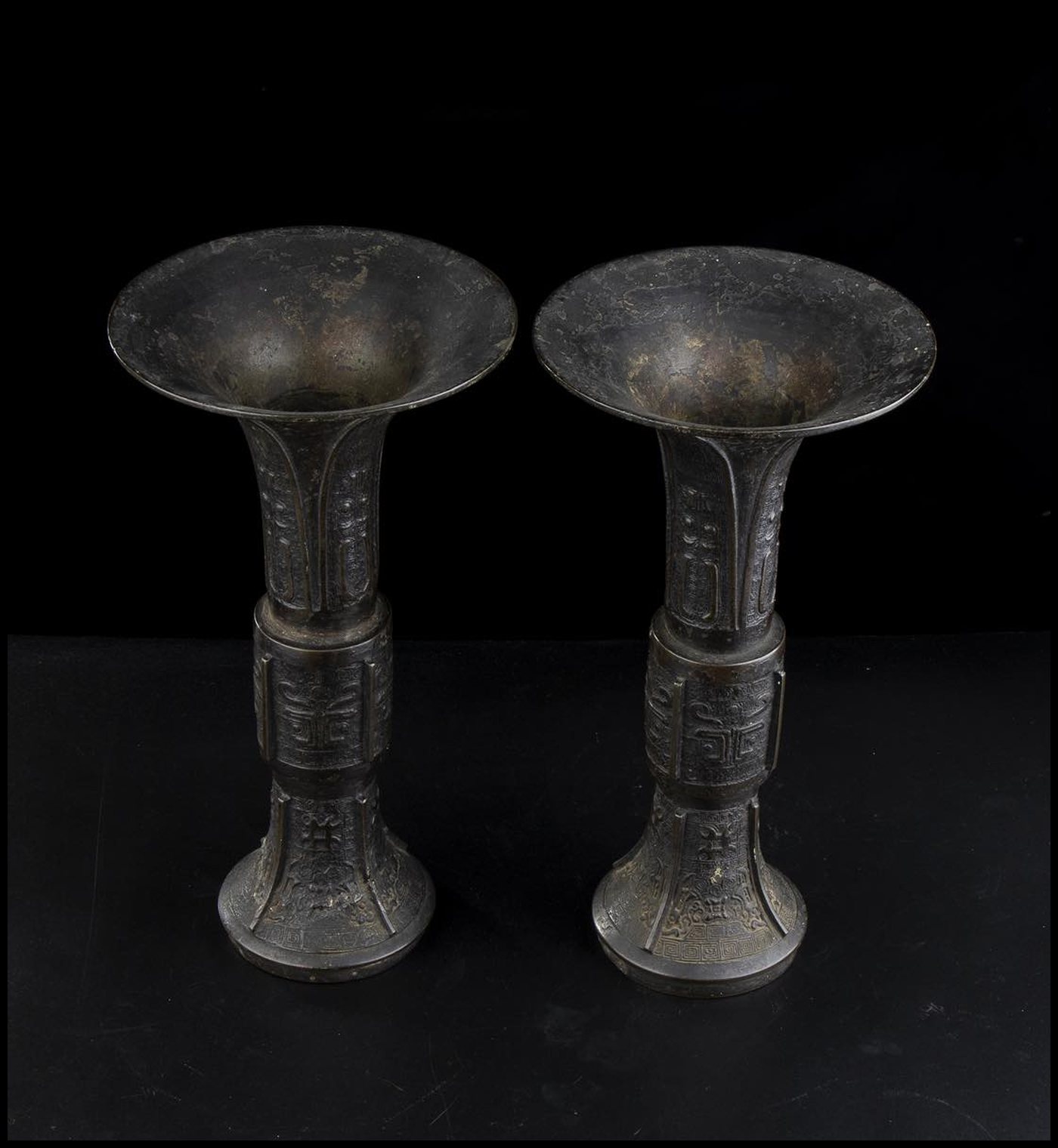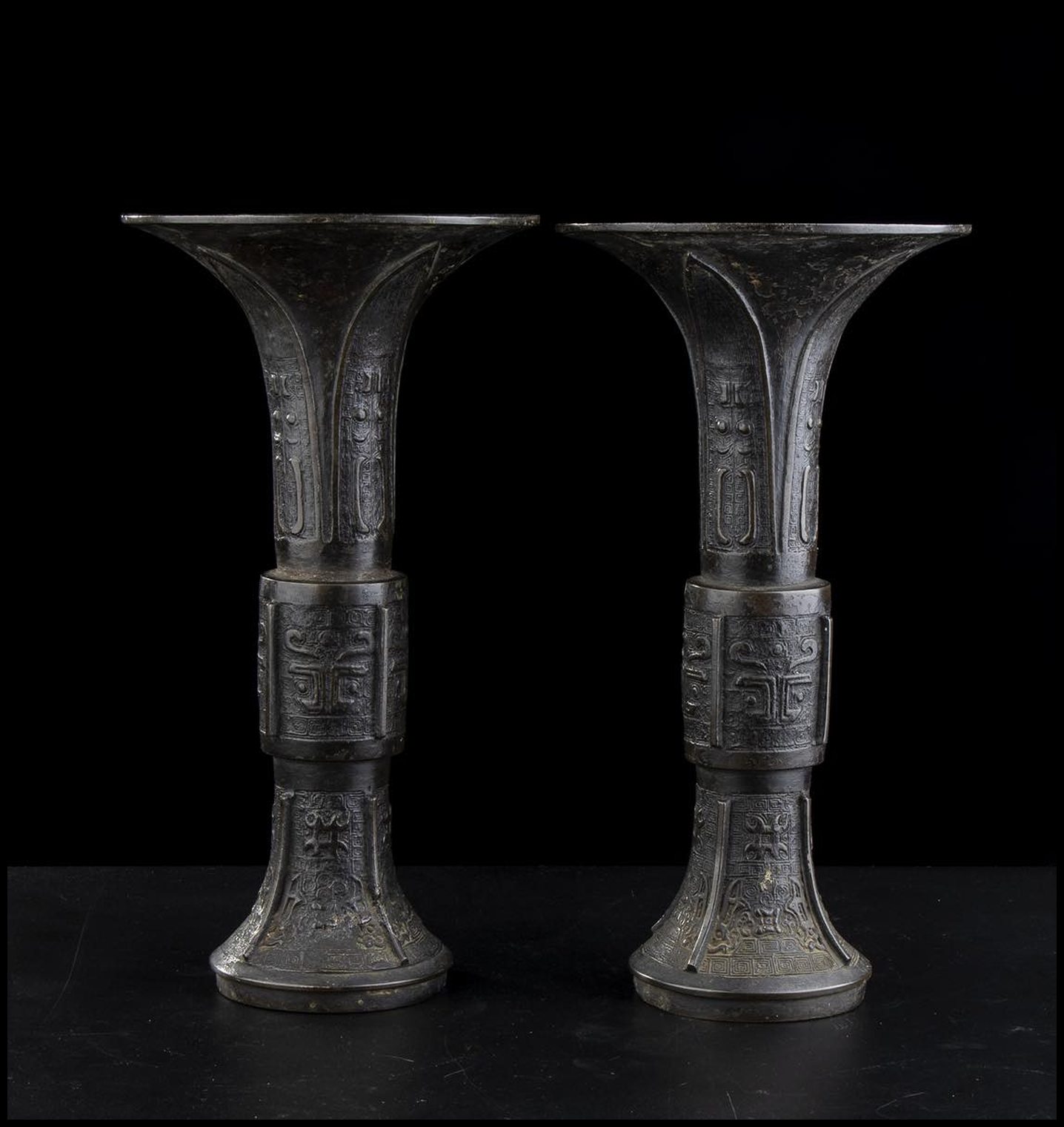COPPIA DI VASI ARCAISTICI IN BRONZO, GU Cina, dinastie Ming/ Qing, XVII secolo