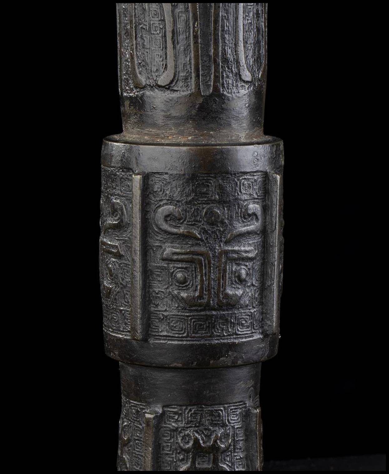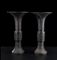A sezione circolare, rigonfiamento nella zona centrale e ampia bocca a tromba, presentano sull'esterno una decorazione a rilievo di gusto arcaico, ispirata ai bronzi rituali di epoche Shang e Zhou, al centro della base di entrambi iscrizione incisa 永寶冊之 (Yong bao ce zhi).