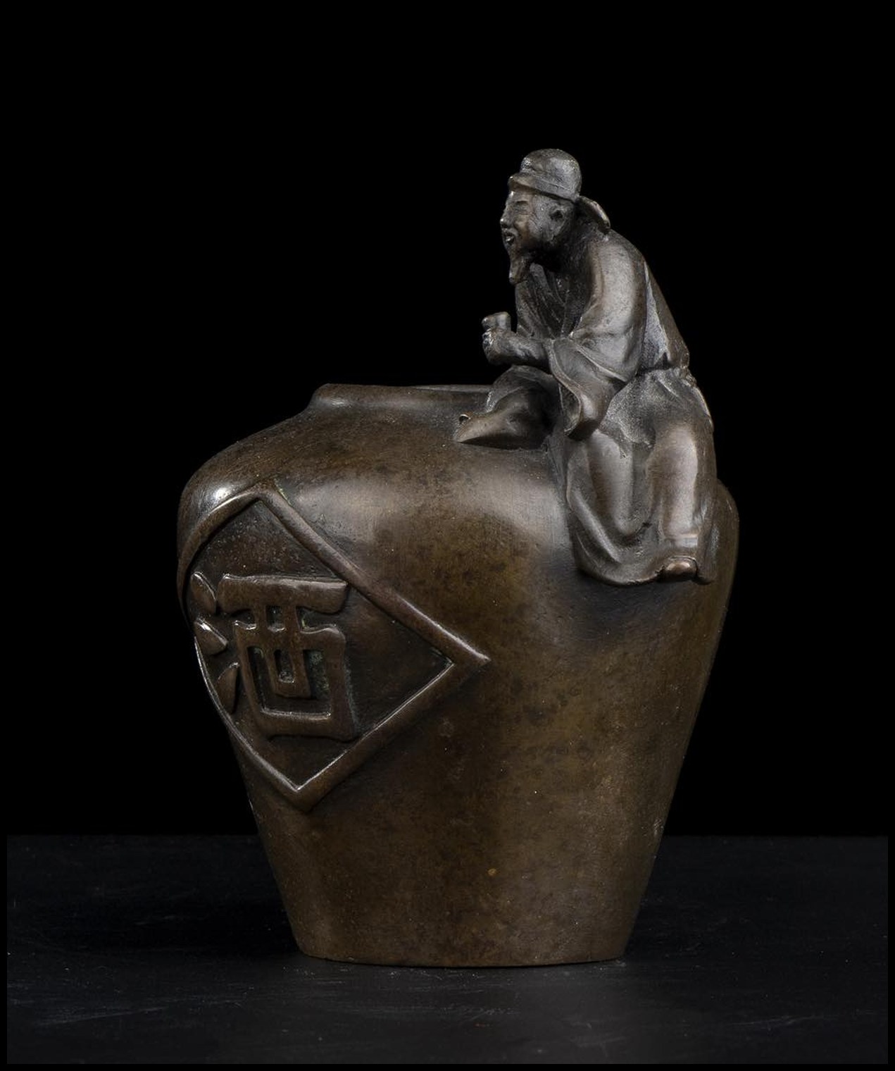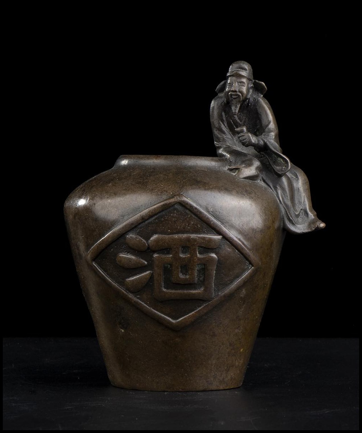 Sul corpo del contenitore il carattere 酒 (jiu, “vino”) in rilievo.