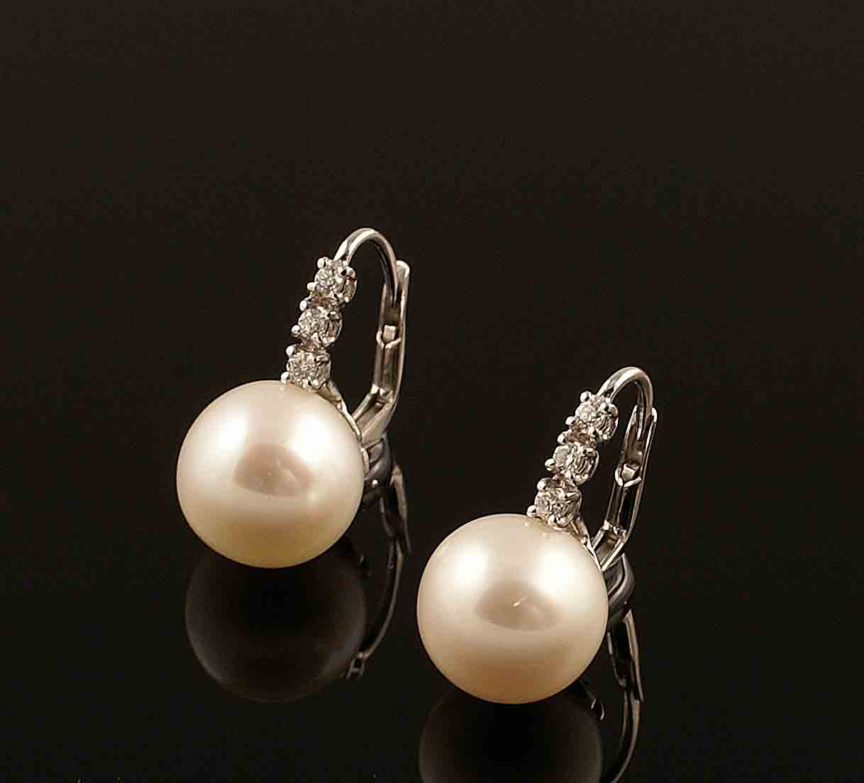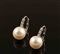 Orecchini a monachina in oro bianco 18kt con incastonate due perle coltivate di mm. 10,5 circa e sei diamanti taglio brillante per 0,12 punti circa, gr. 5,4.
