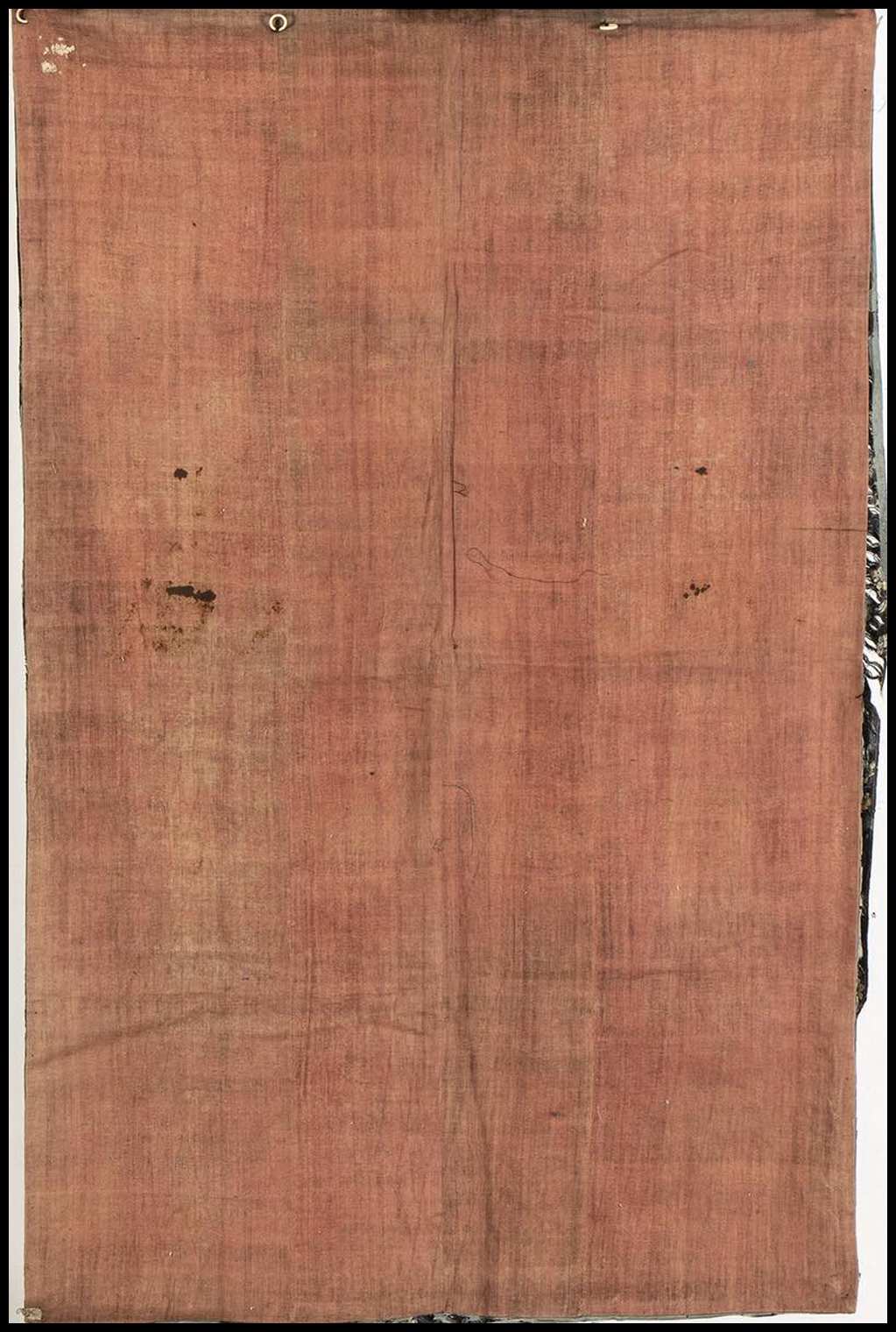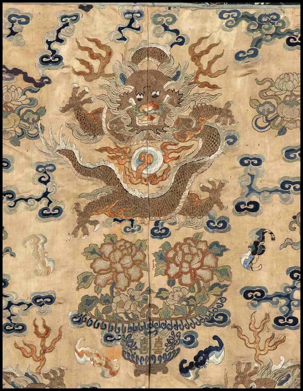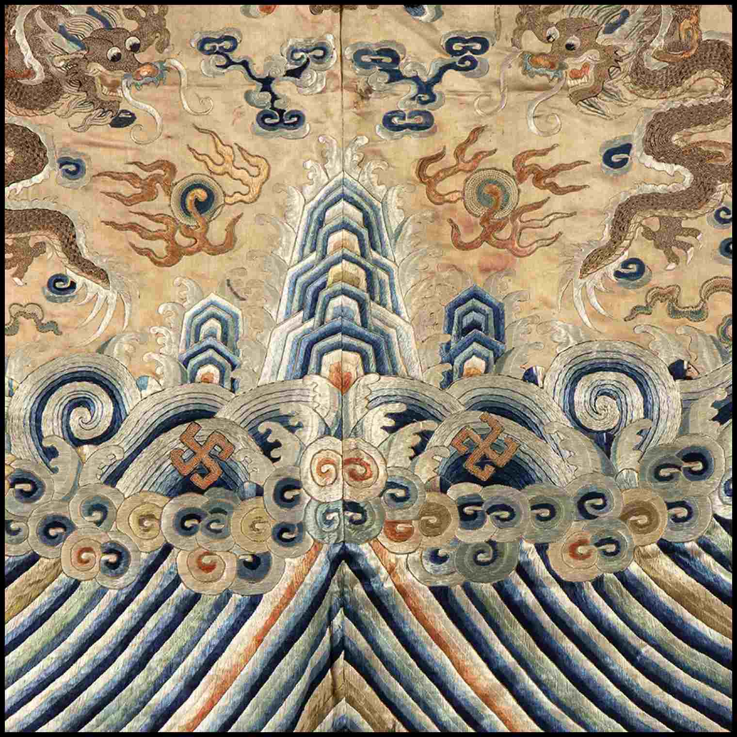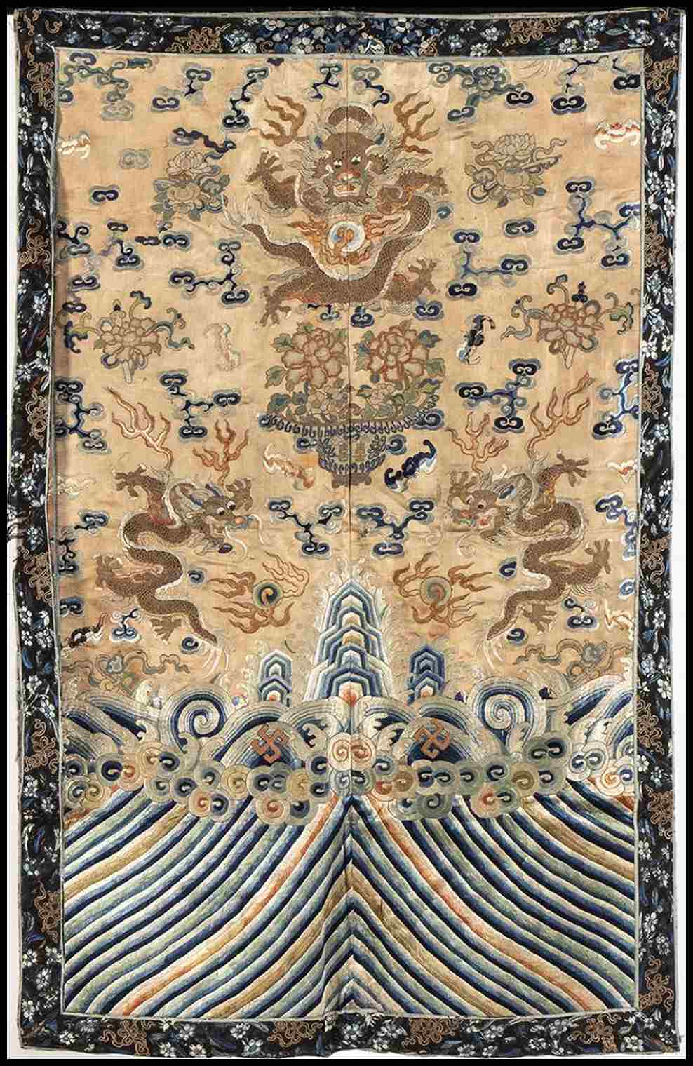 Finemente decorato con una scena di tre draghi in volo tra nuvole stilizzate come lingzhi, saette, pipistrelli e composizioni floreali in vaso, in basso onde stilizzate, tre picchi rocciosi e per due volte il carattere wan, il perimetro con stralcio in seta non pertinente, sul lato superiore anelli per appenderlo.