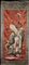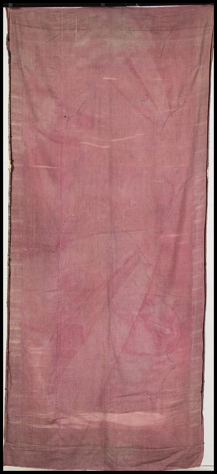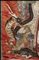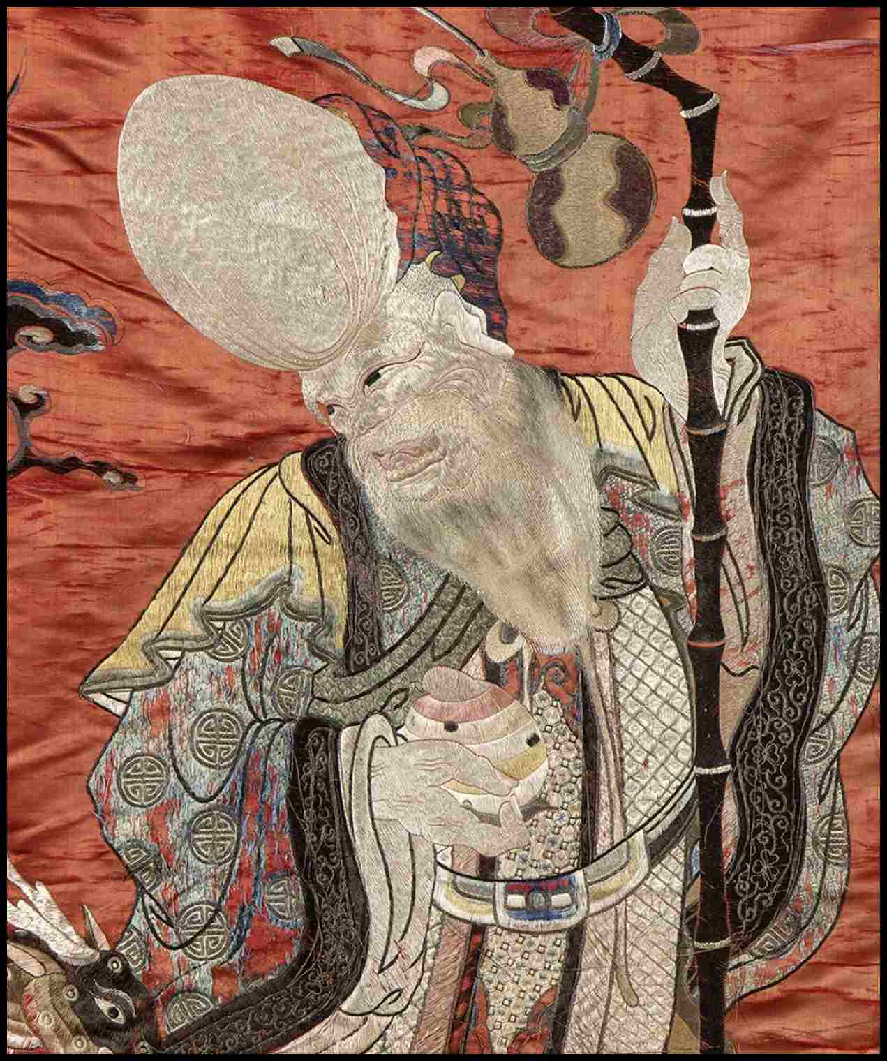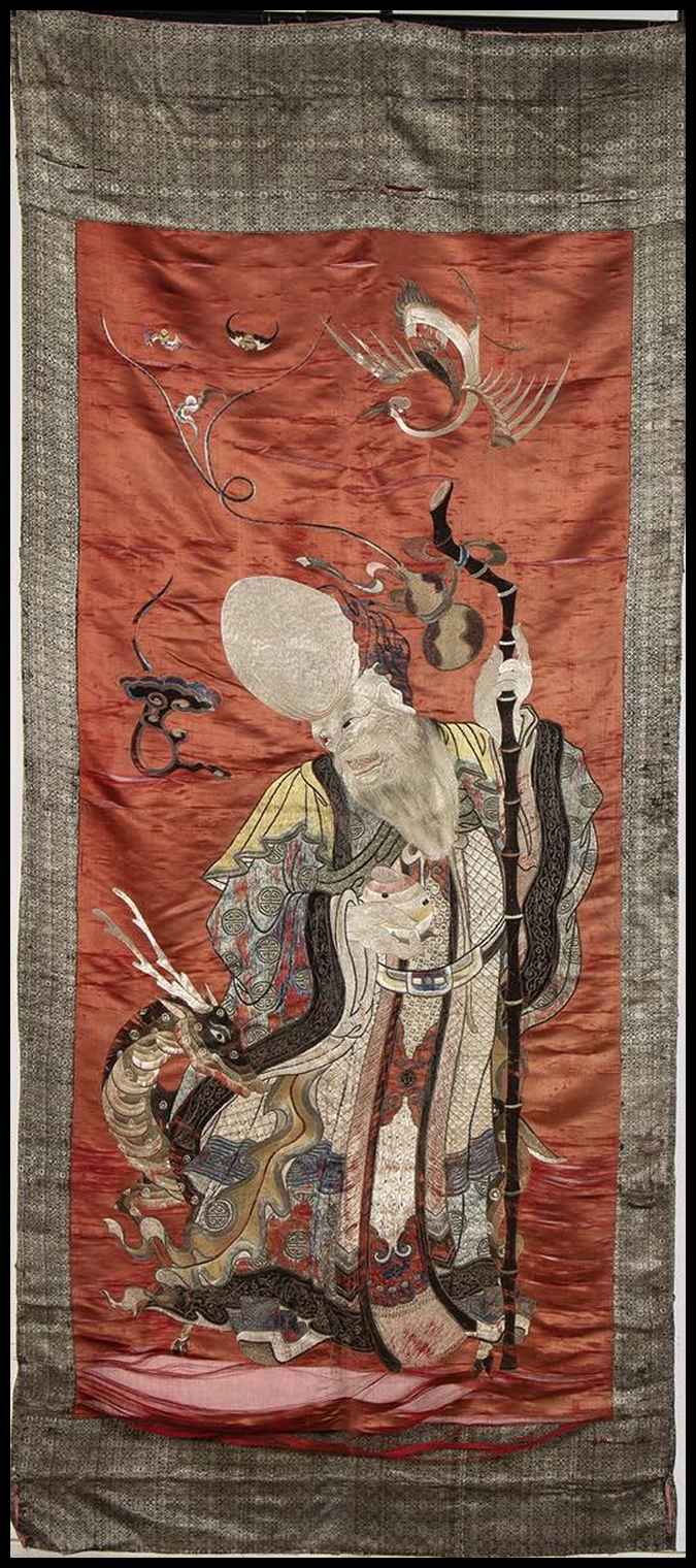 Il grande riquadro centrale a fondo rosso con una composizione con Shoulao affiancato da un cervo, nella mano sinistra un bastone al quale è appesa una fiasca a zucca, nella mano destra una pesca, la barba in crine, in alto una gru e tre pipistrelli in volo, la cornice in tessuto non pertinente.