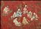 Il grande riquadro centrale a fondo rosso con decoro policromo con gli Otto Immortali Taoisti (baxian) e più in alto Shoulao e Xiwangmu, la bordura in seta non pertinente.