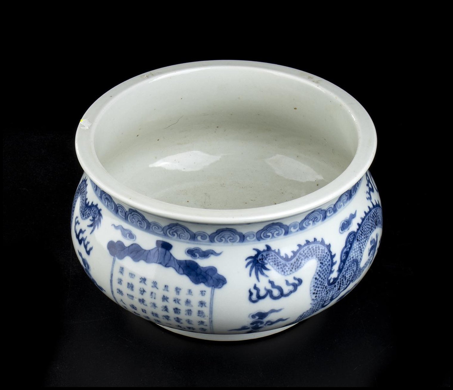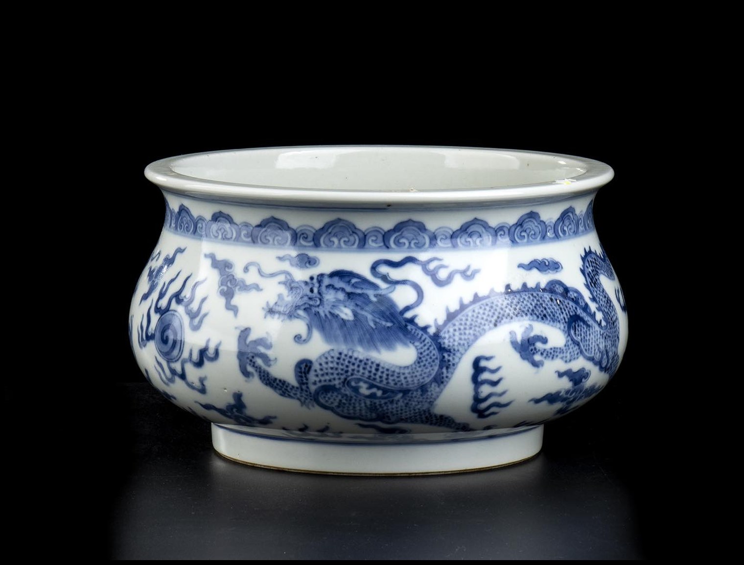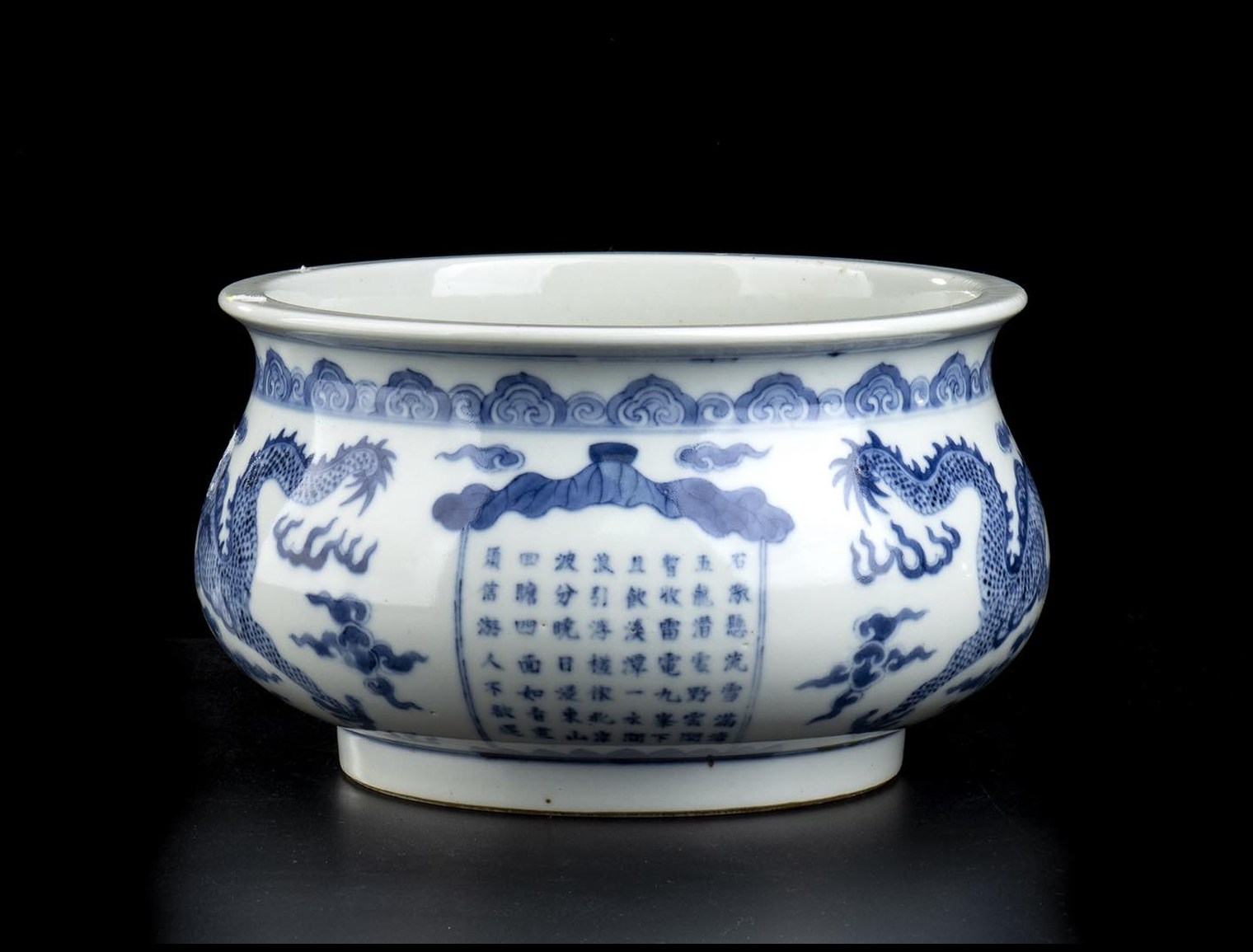 A sezione circolare, l'esterno del corpo con due draghi all'inseguimento della perla in volo tra nuvole stilizzate e saette, verso la bocca una banda con teste di scettro ruyi.