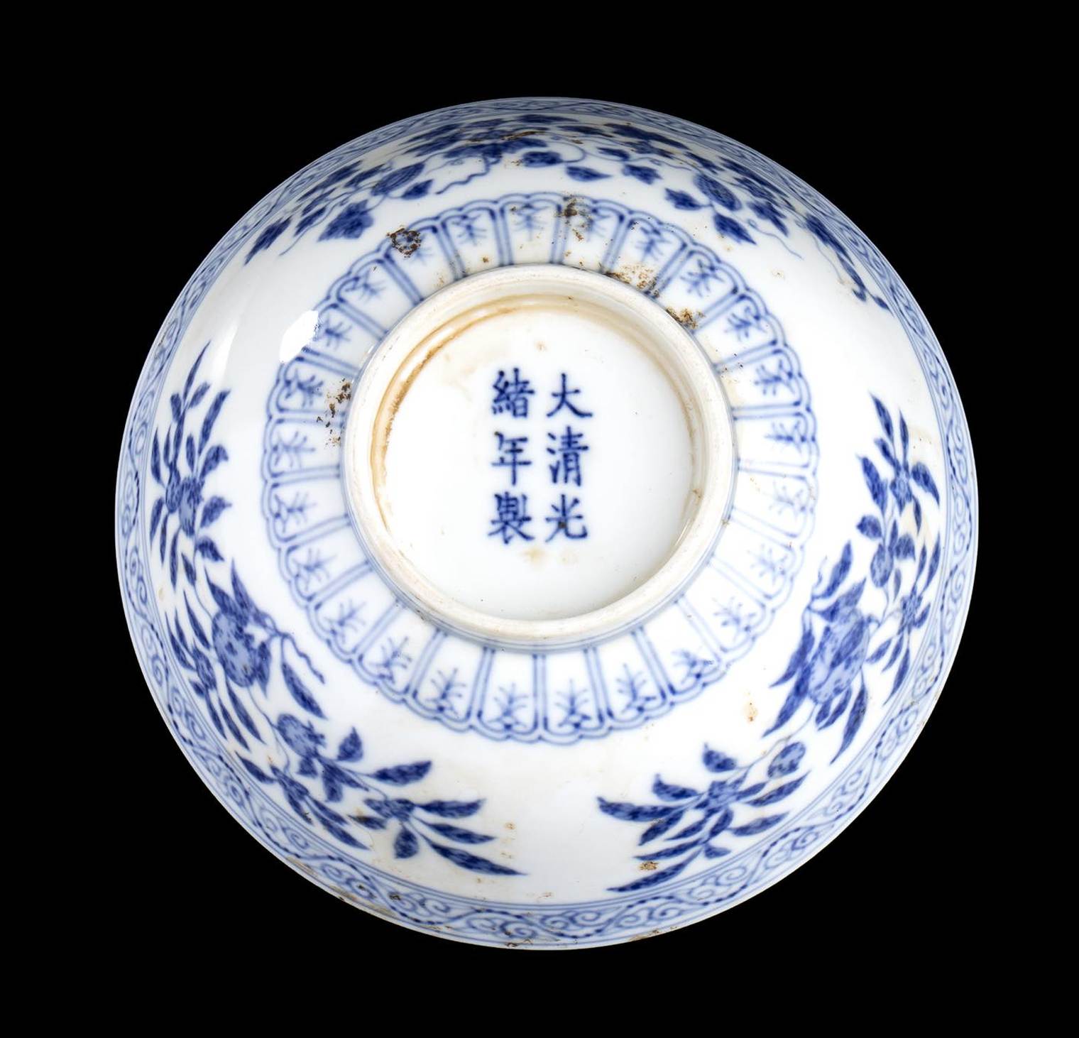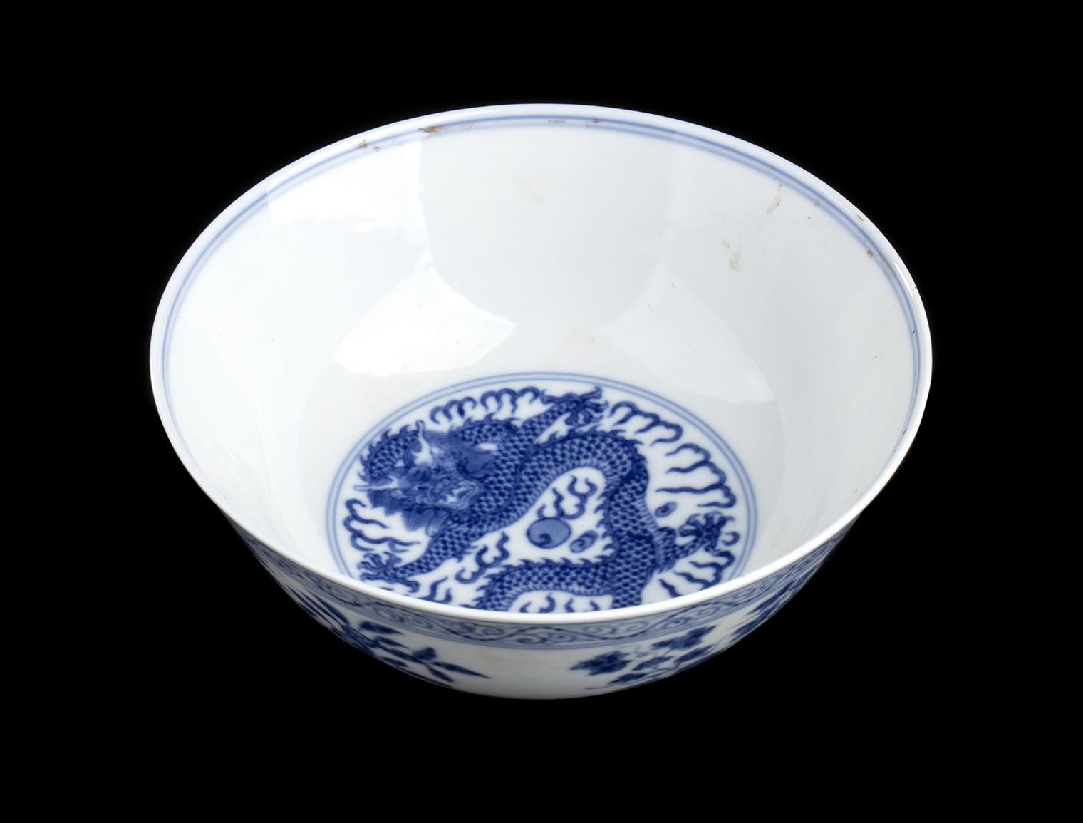 Decorata sull’esterno con motivi floreali di gusto Ming, all’interno un medaglione circolare con drago in volo tra nuvole stilizzate, marchio Guangxu a sei caratteri al centro della base.