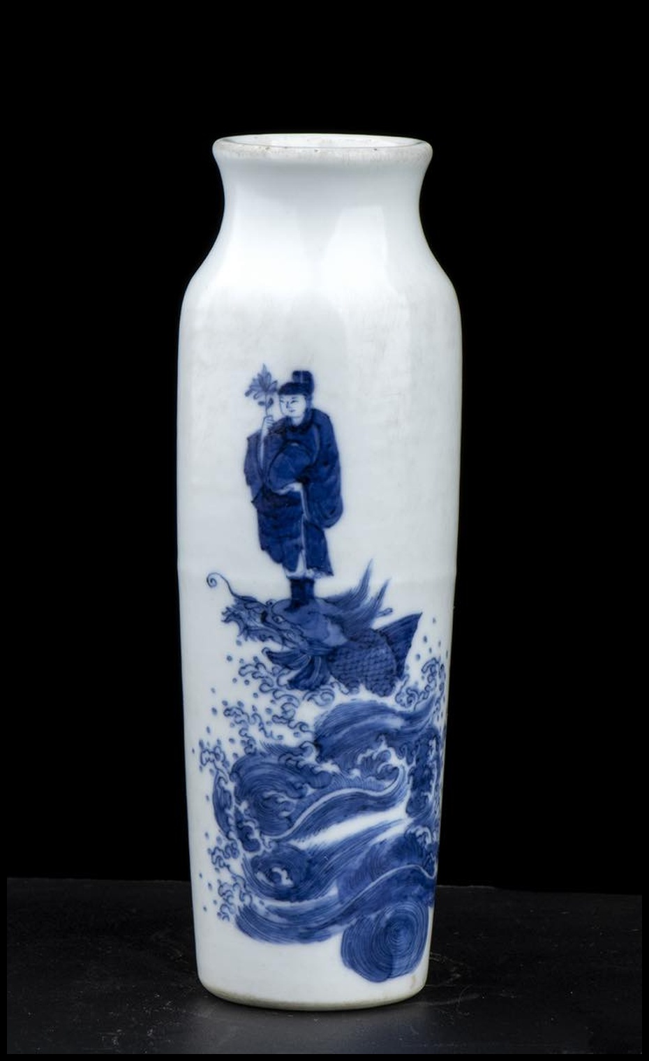 La decorazione mostra una figura stante sulla testa di un drago che cavalca onde marine.