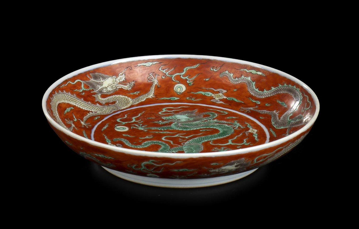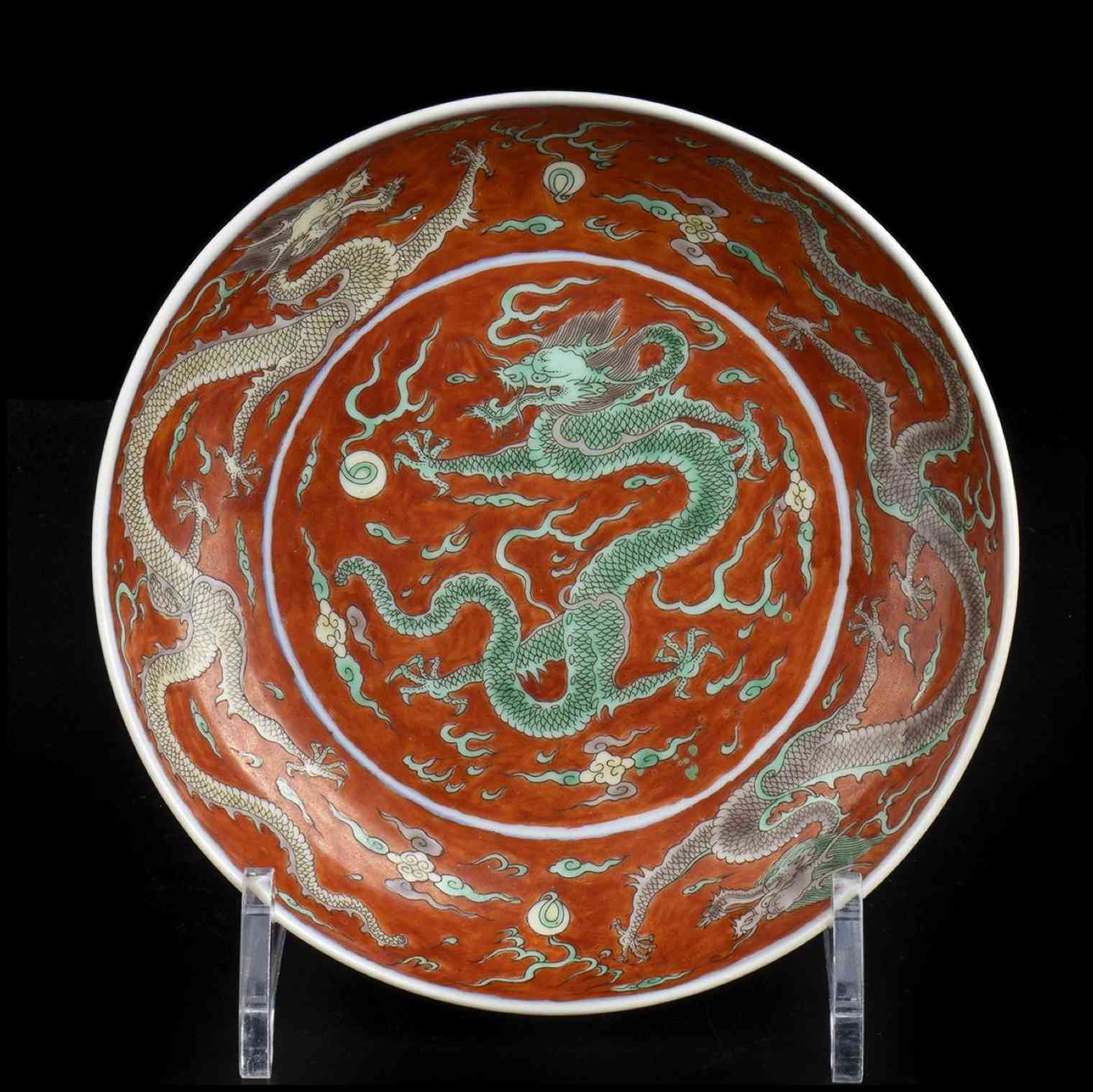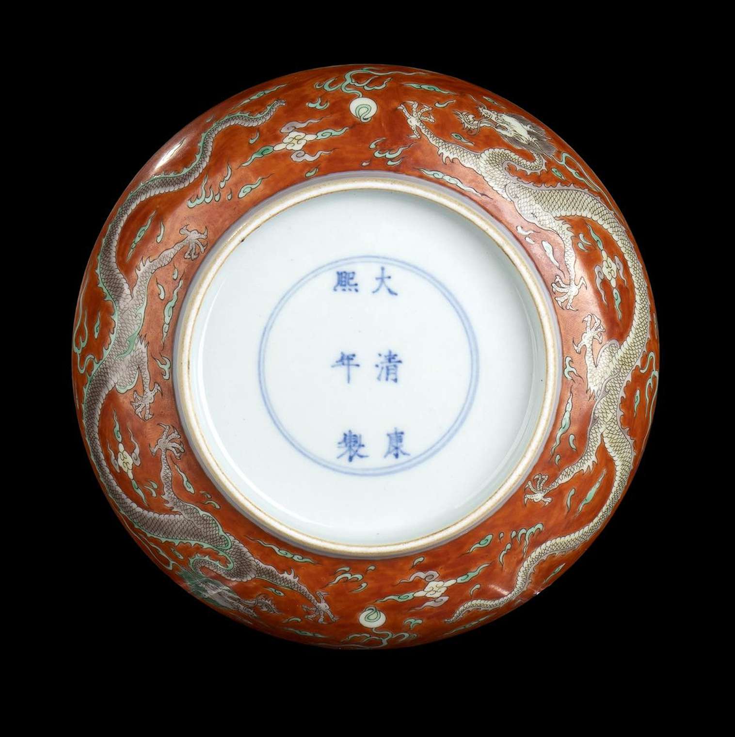 La decorazione consiste di draghi in volo tra nuvole e saette all'inseguimento della perla, marchio apocrifo di Kangxi al centro della base.