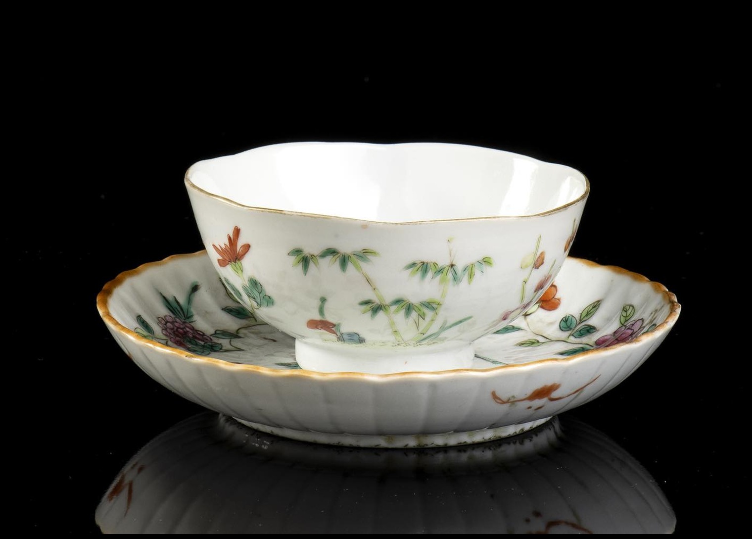 TAZZINA E PIATTINO IN PORCELLANA CON DECORO A SMALTI POLICROMI