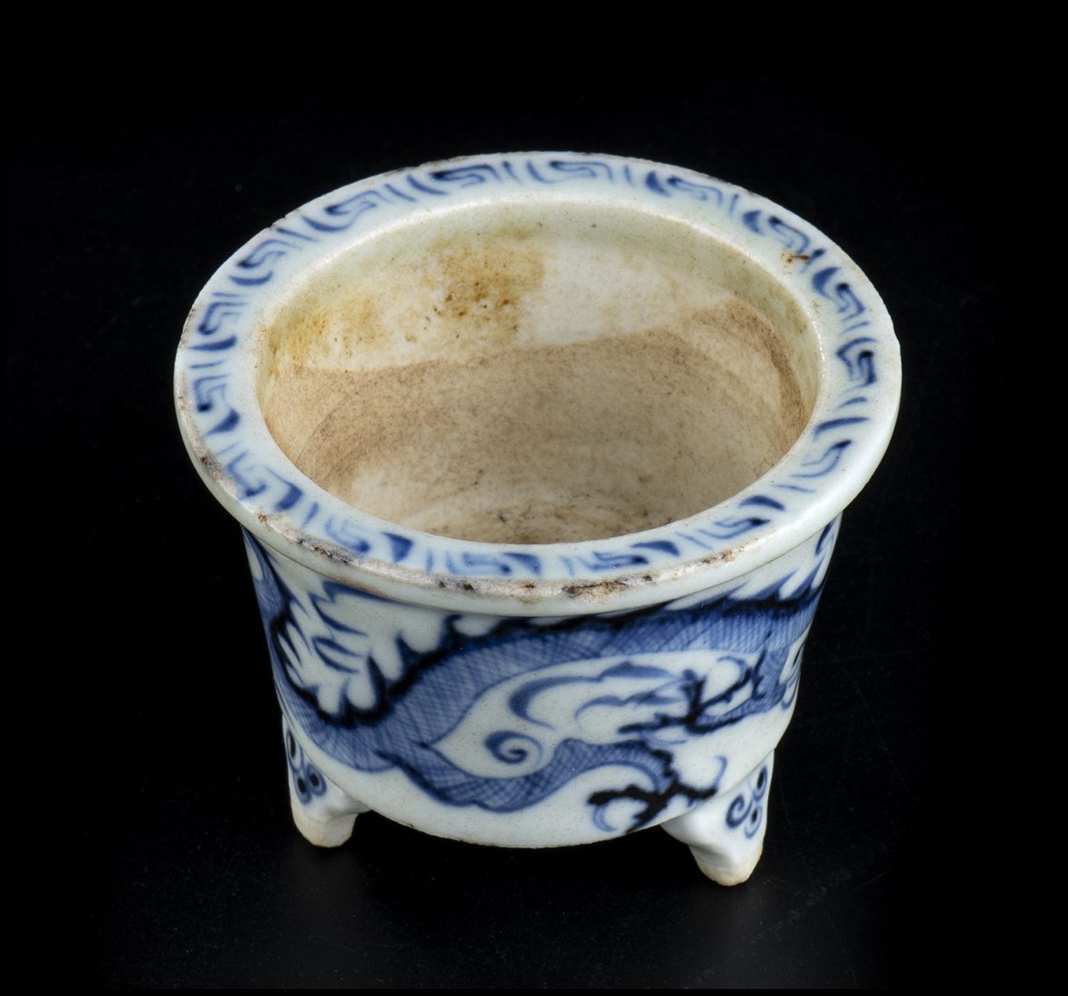 PICCOLO INCENSIERE IN PORCELLANA 'BIANCO E BLU' CON DECORO DI DRAGHI