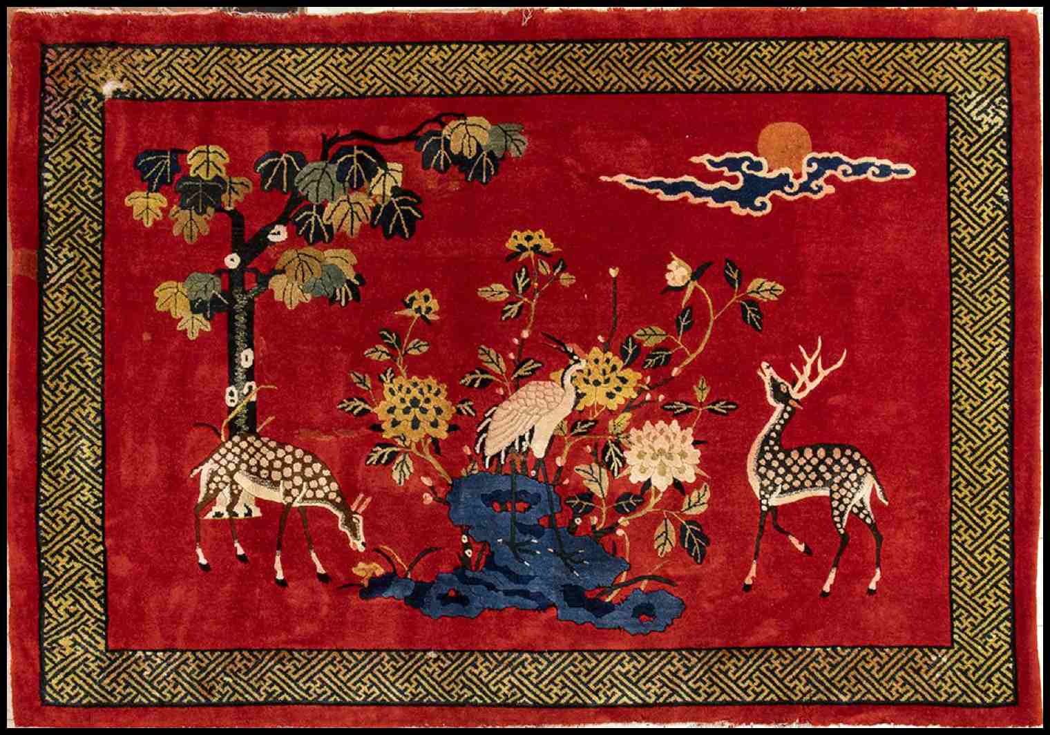 La scena centrale, racchiusa da bordura geometrica, consiste di una roccia taihu, fiori di peonia, un albero di pino, due cervi e una gru, tutti elementi con forte carica simbolica.