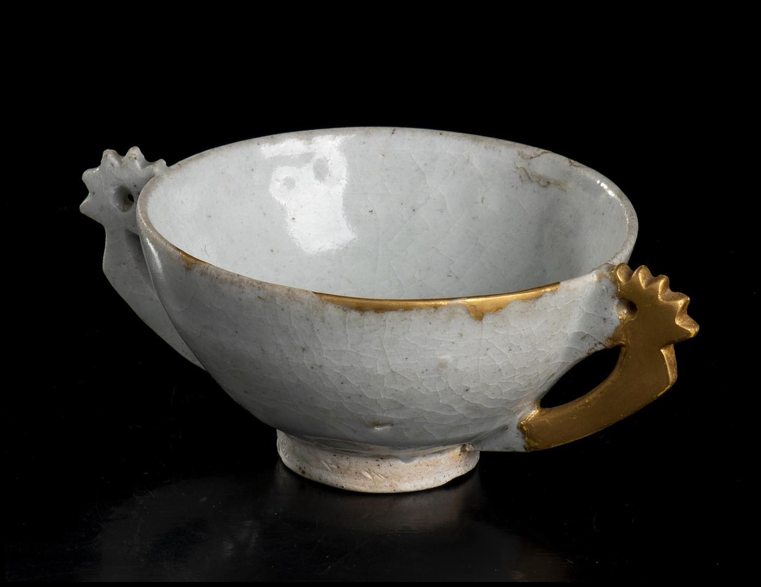 COPPA CON ANSE IN PORCELLANA INVETRIATA CON RESTAURO IN LACCA DORATA Corea, dinastia Joseon, fine del XV secolo