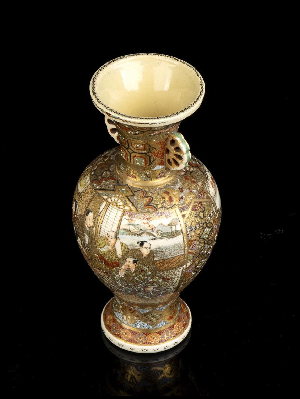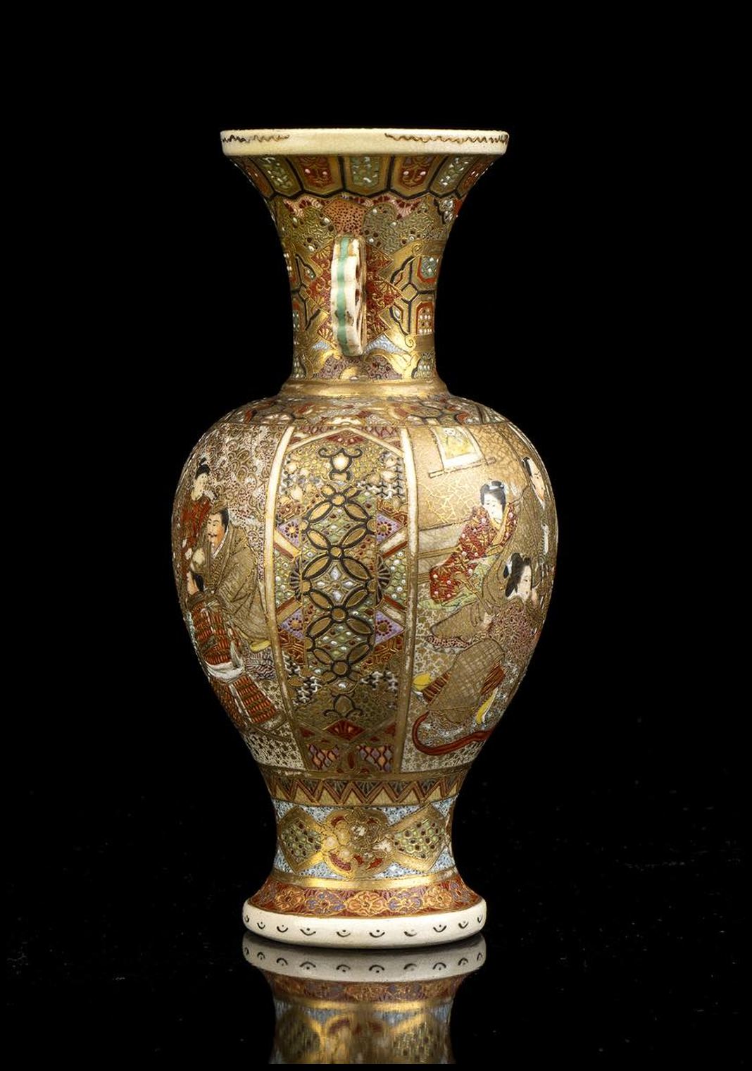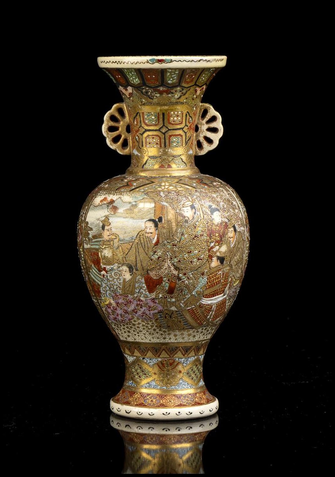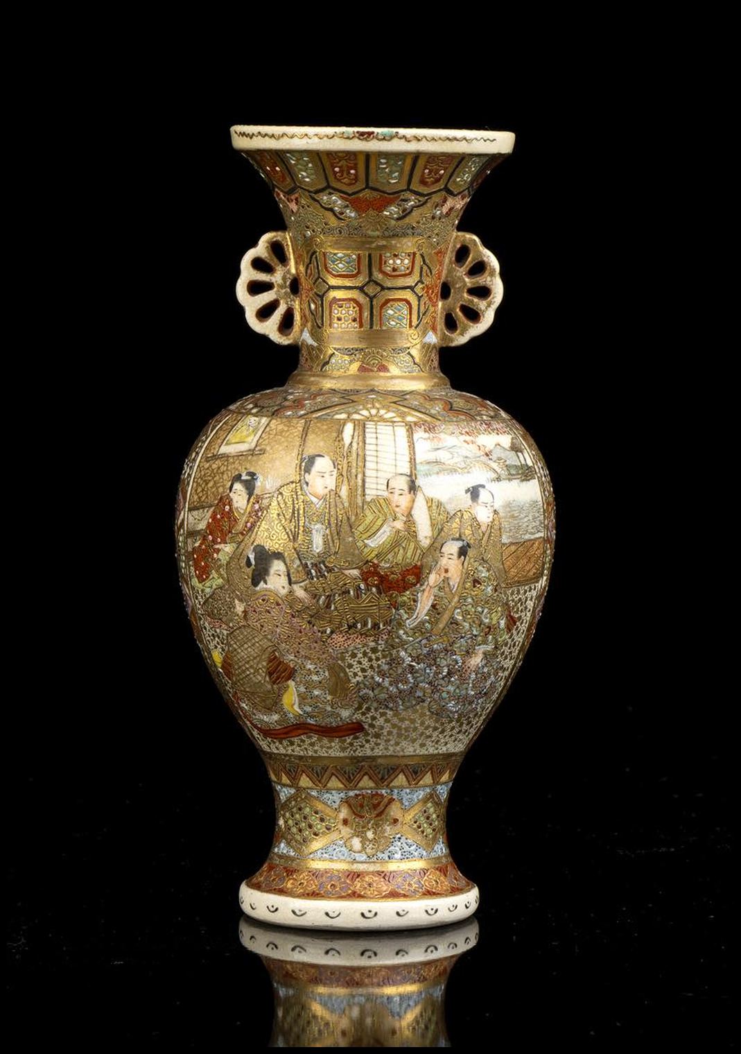 PICCOLO VASO A BALAUSTRO CON ANSE IN CERAMICA 'SATSUMA' CON DECORO A SMALTI POLICROMI E ORO Giappone, periodo Meiji