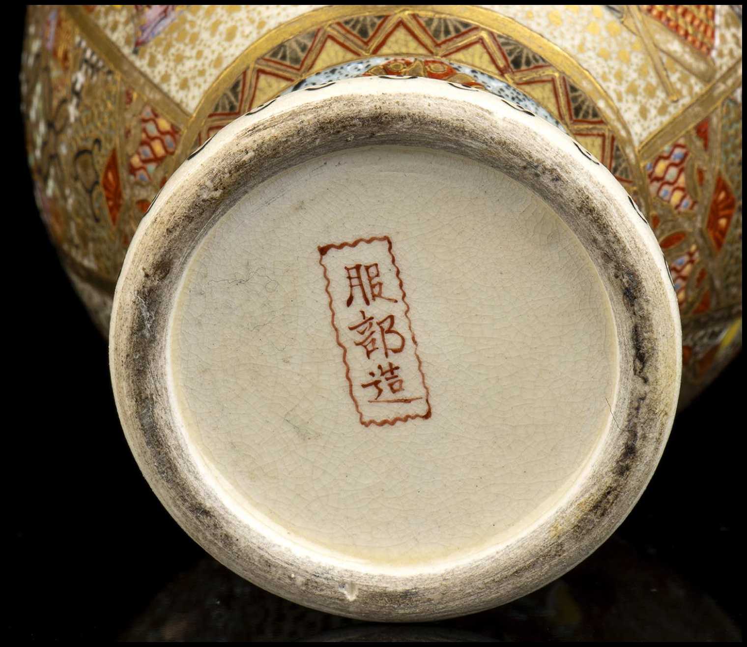 Sul corpo la decorazione consiste di riserve con figure tra architetture e paesaggio, firmato 服部造 (Hattori zō) al centro della base.