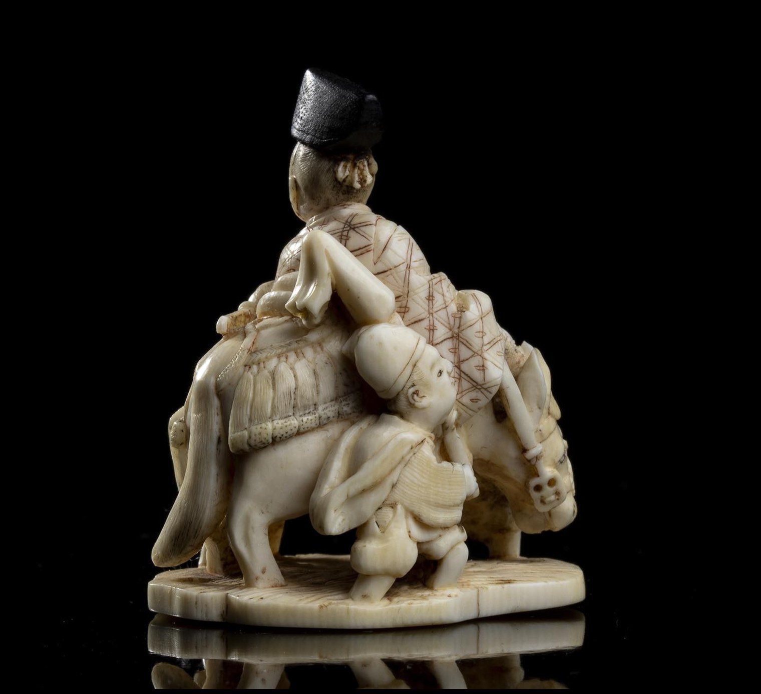 Il netsuke raffigura il nobile poeta Ariwara no Narihira (825-880) in groppa ad un cavallo intorno al quale si dispongono tre giovani servi, il copricapo in legno, himotoshi sulla base, firmato 鶯里軒 (Ōriken, “La bottega nel villaggio dell'usignolo”) entro cartiglio sulla base.