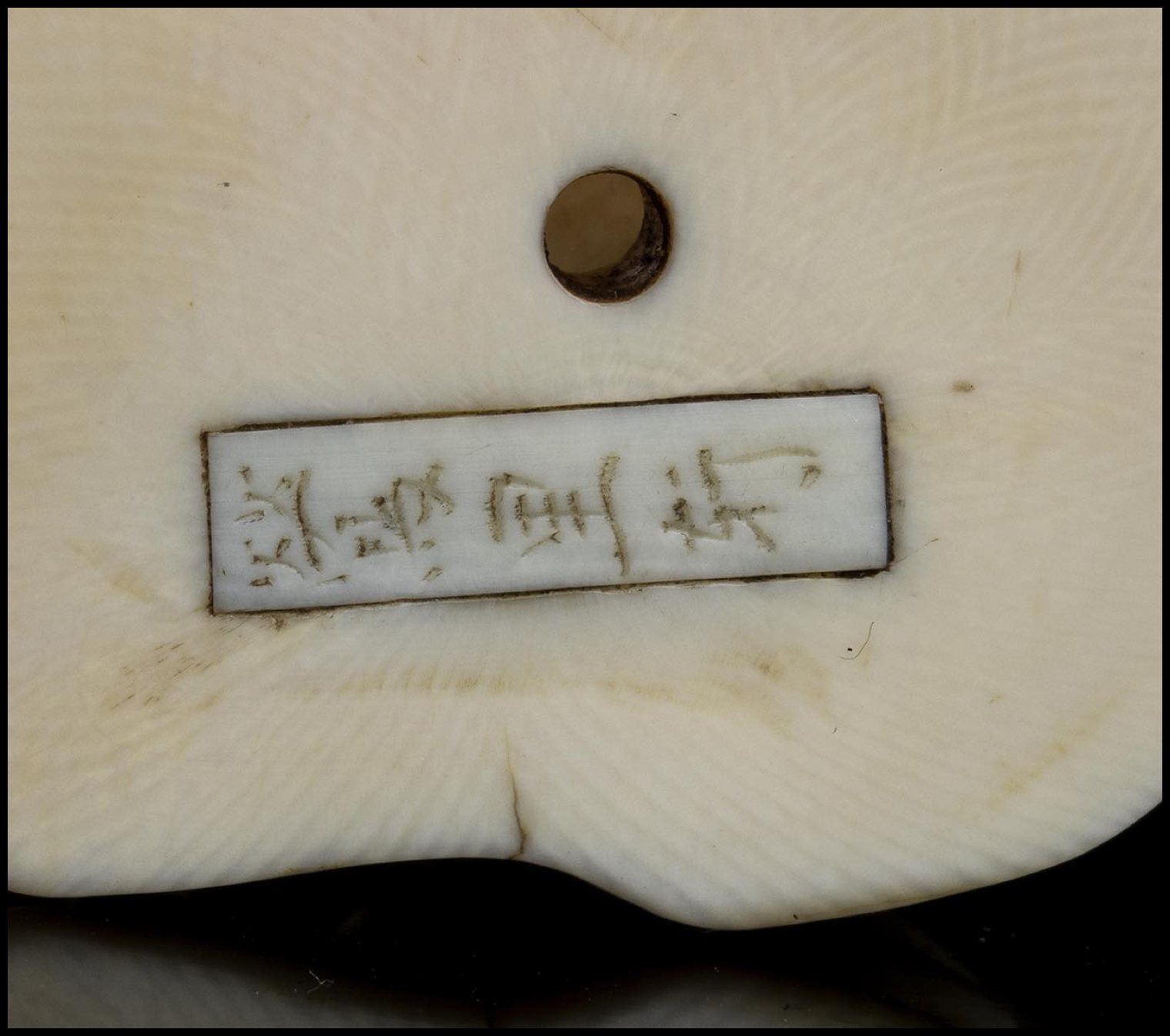 La firma sulla base corrisponde a Rakumin Jitokusai, artista attiva a Kyoto nel XIX secolo, allievo di Rantei e specializzato nell'intaglio di netsuke con animali.