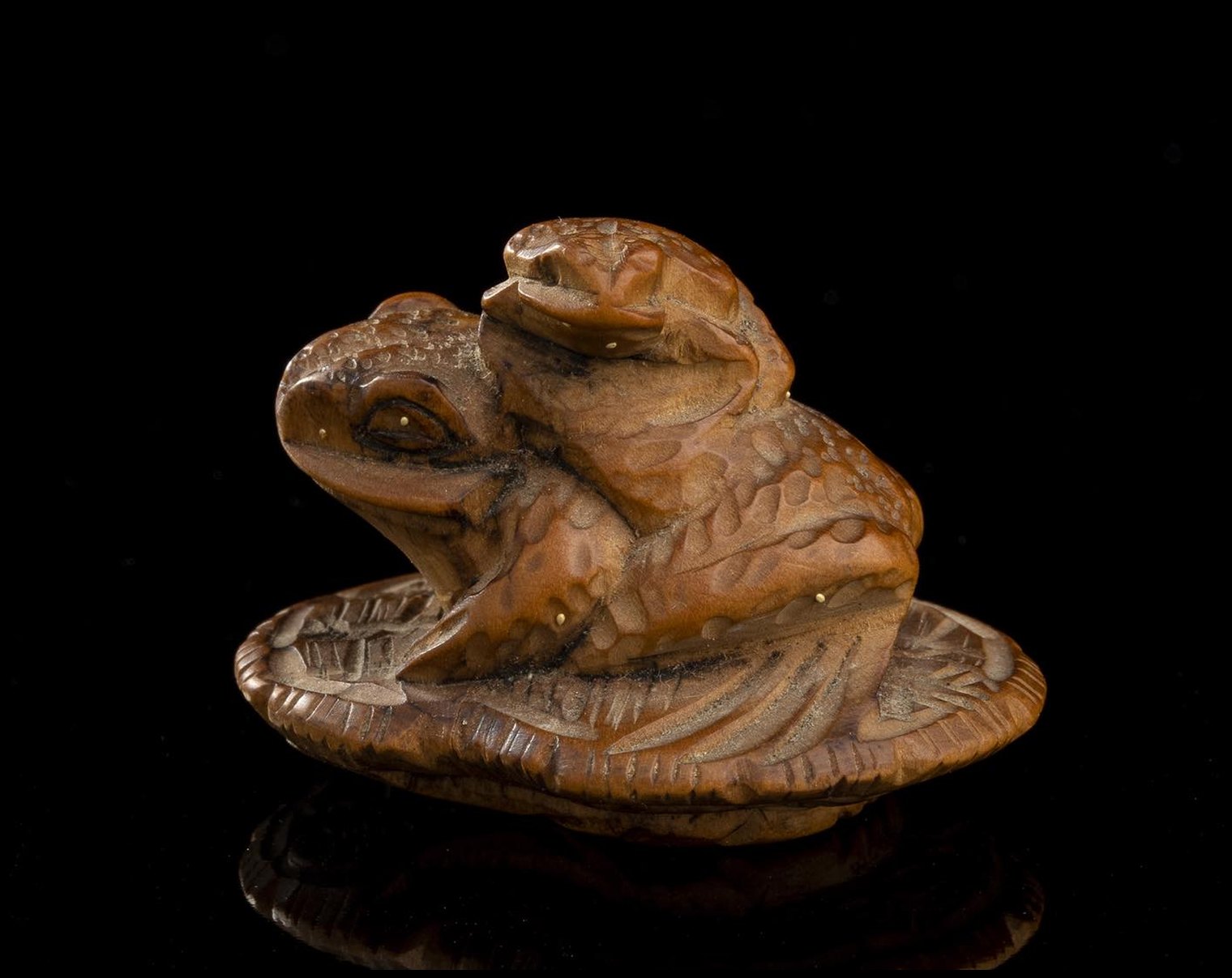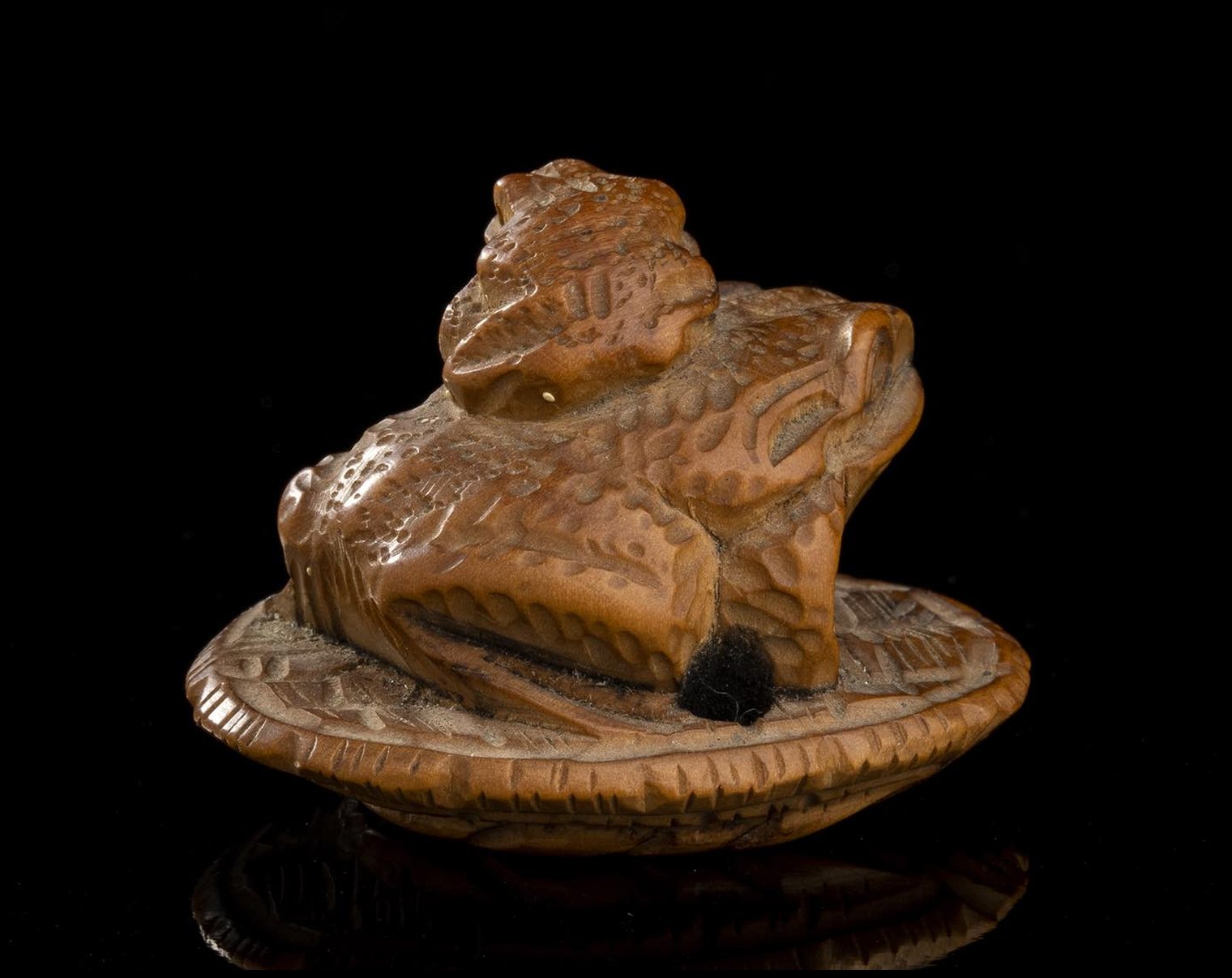 NETSUKE IN LEGNO DI BOSSO CON ROSPI SU SANDALO DI PAGLIA