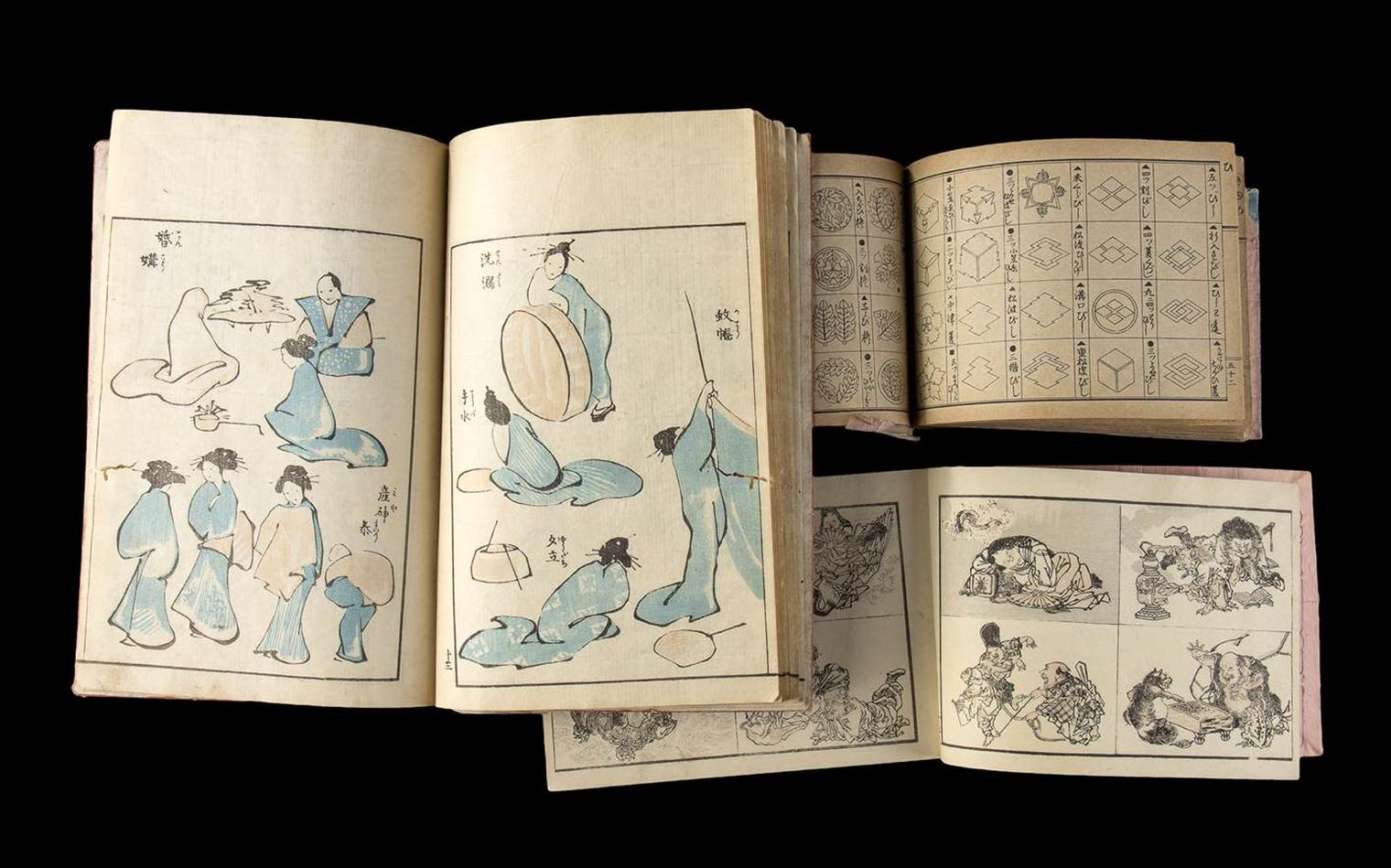 Insieme a un libro di schizzi a xilografie policrome (23 x 15,5 cm) e a un libro di stemmi araldici kamon (11 x 15,5 cm)