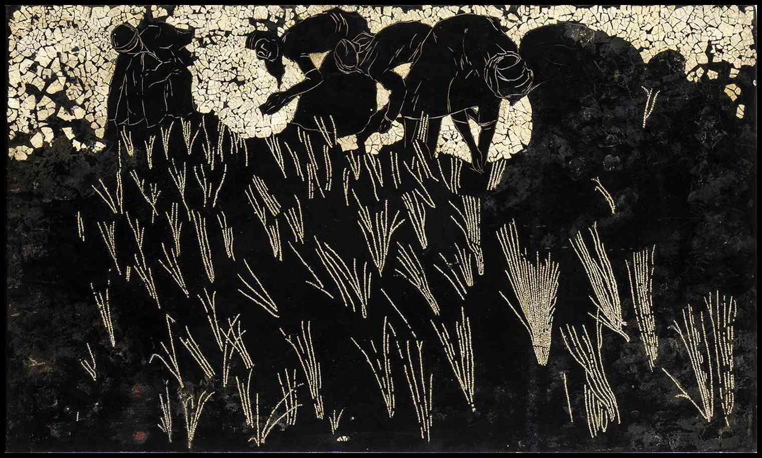 Raffigura alcuni contadini alle prese con la raccolta del riso.
