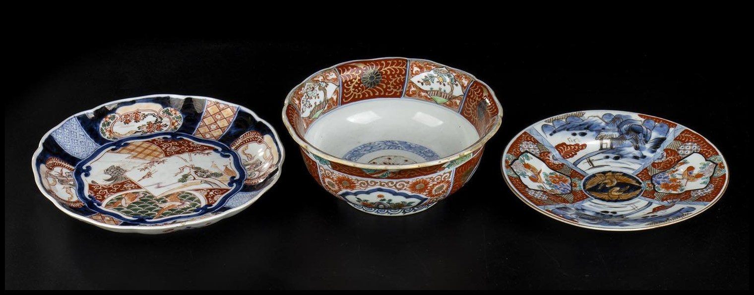UNA CIOTOLA E DUE PIATTI IN PORCELLANA 'IMARI' Giappone, periodo Meiji