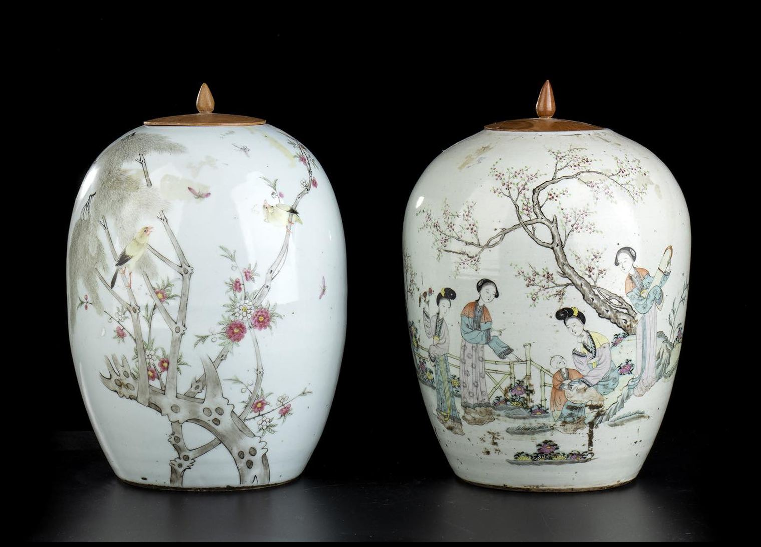 COPPIA DI VASI IN PORCELLANA CON DECORO A SMALTI POLICROMI Cina, XX secolo