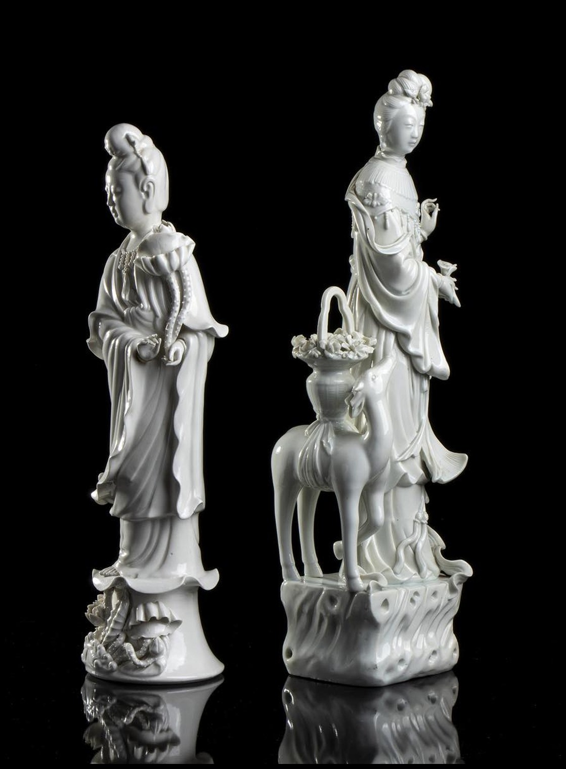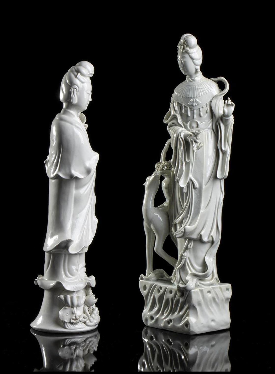 DUE DIVINITÀ FEMMINILI IN PORCELLANA 'BLANC DE CHINE'