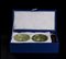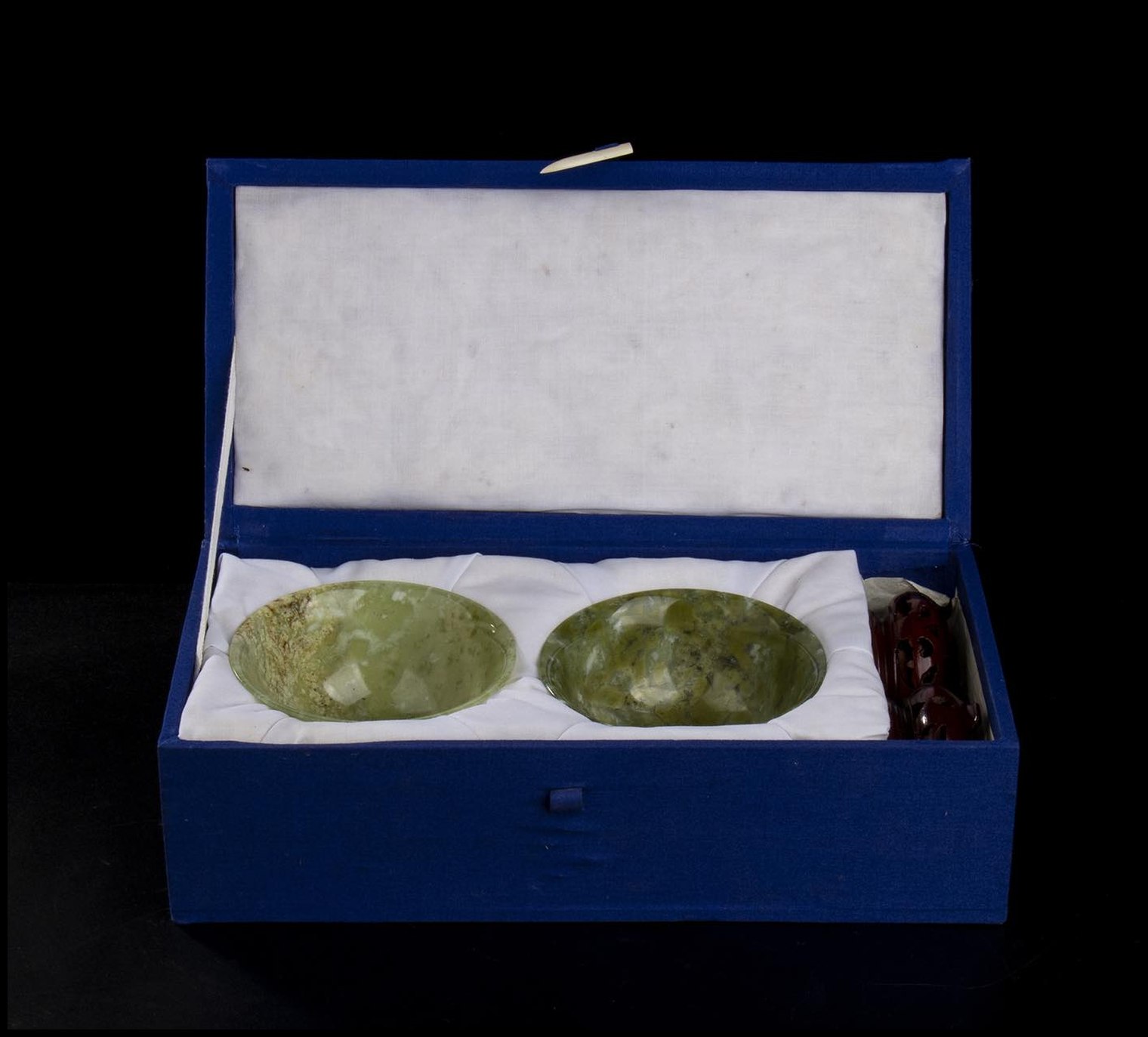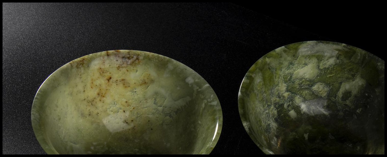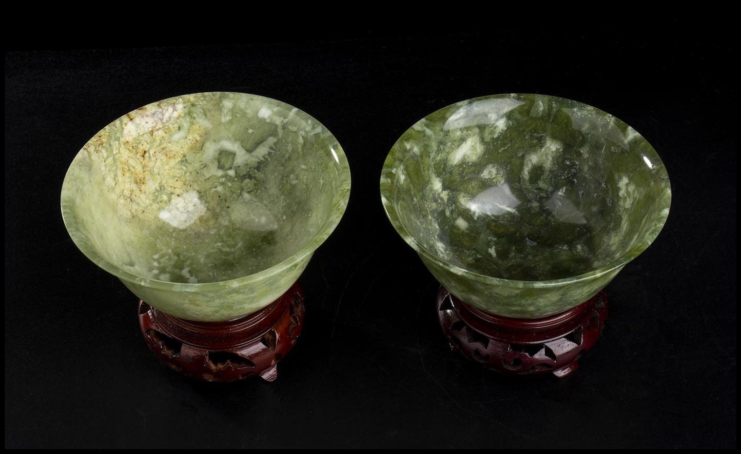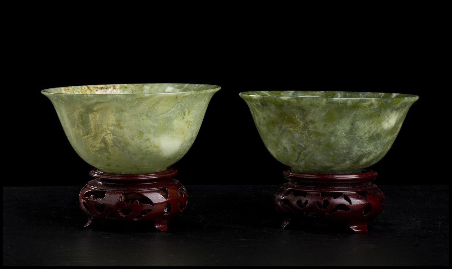 COPPIA DI CIOTOLE IN PIETRA VERDE CON BASE IN LEGNO Cina, XX secolo