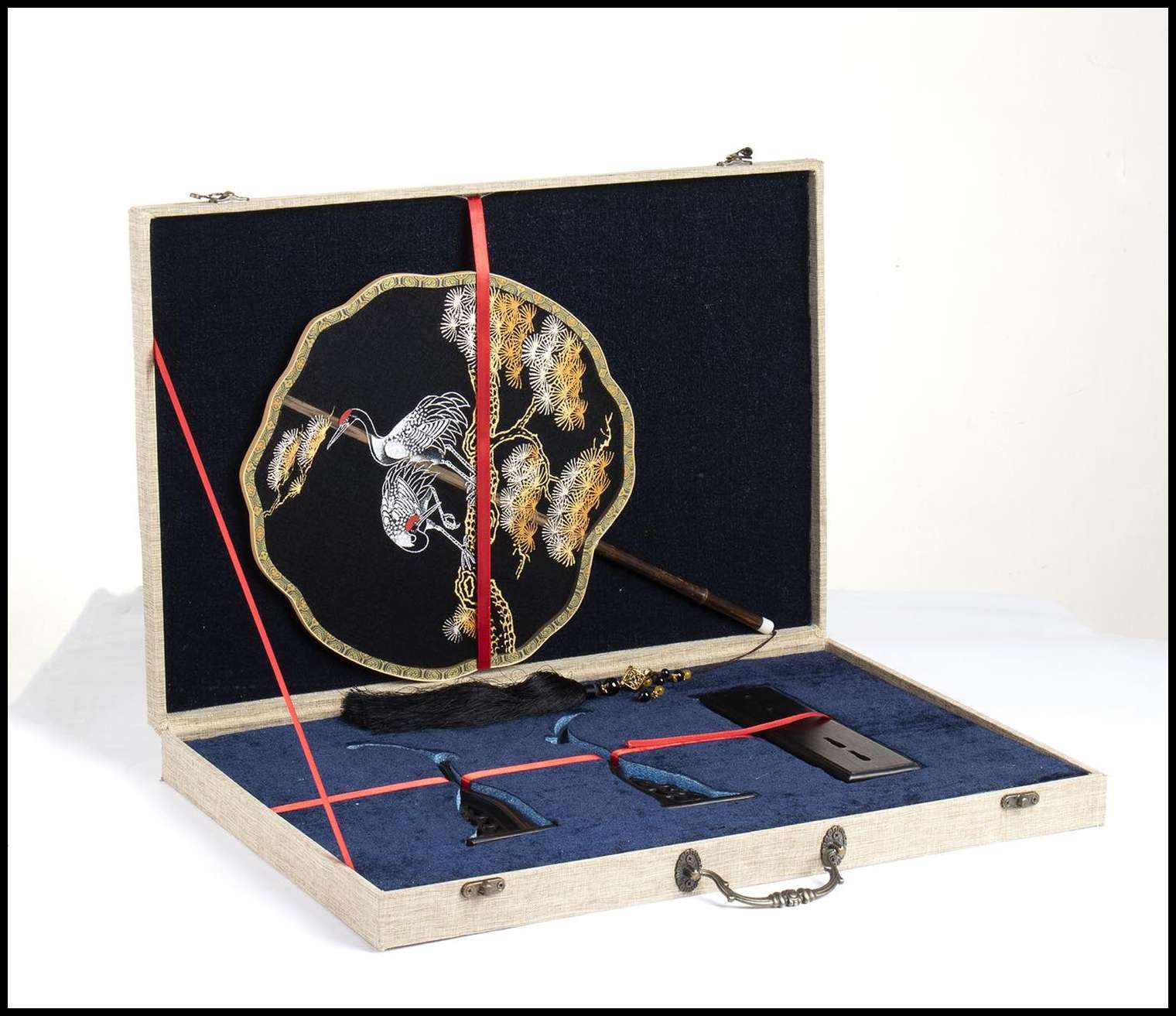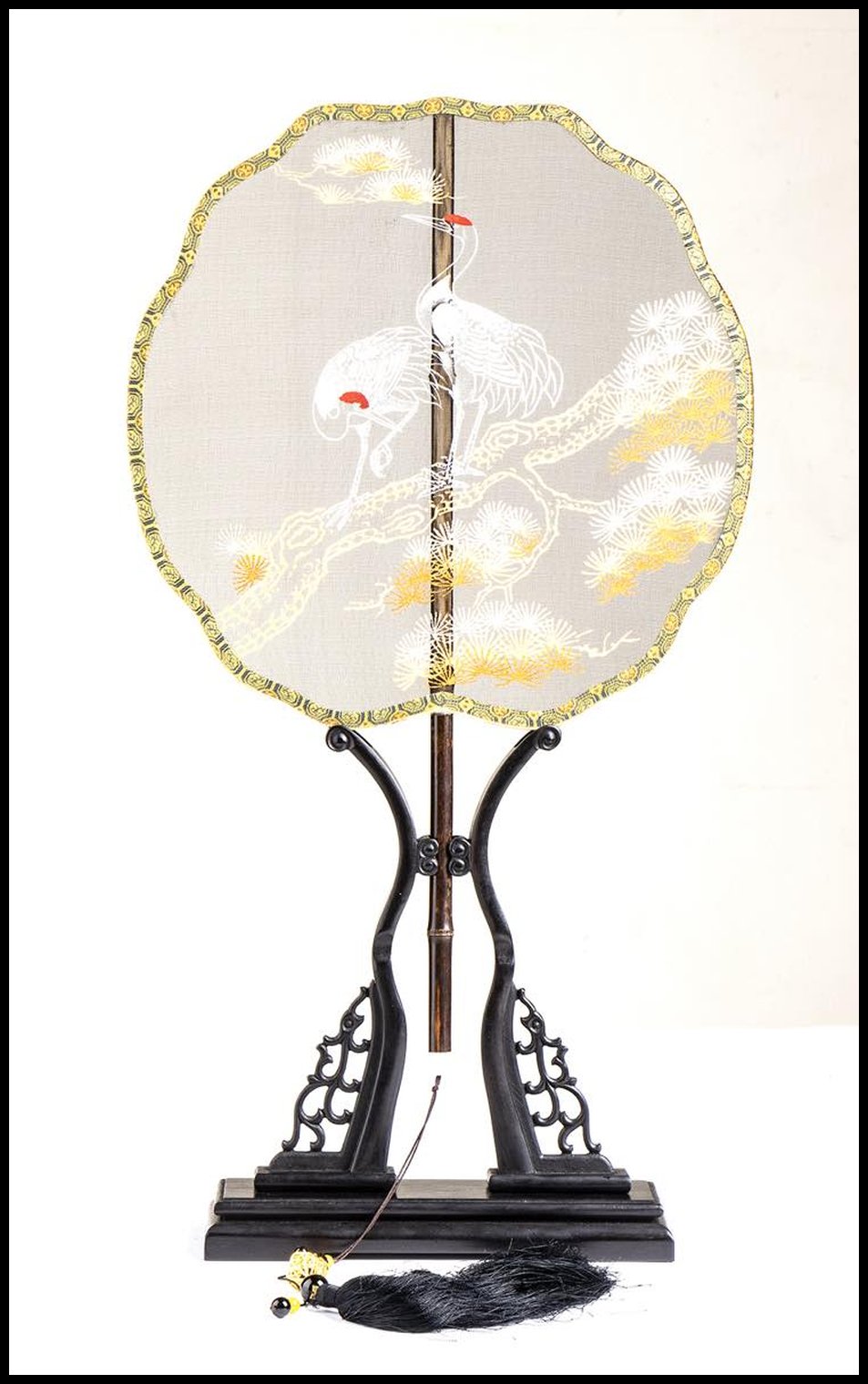 VENTAGLIO IN GARZA DIPINTA CON SUO SOSTEGNO IN LEGNO Cina, XX secolo
