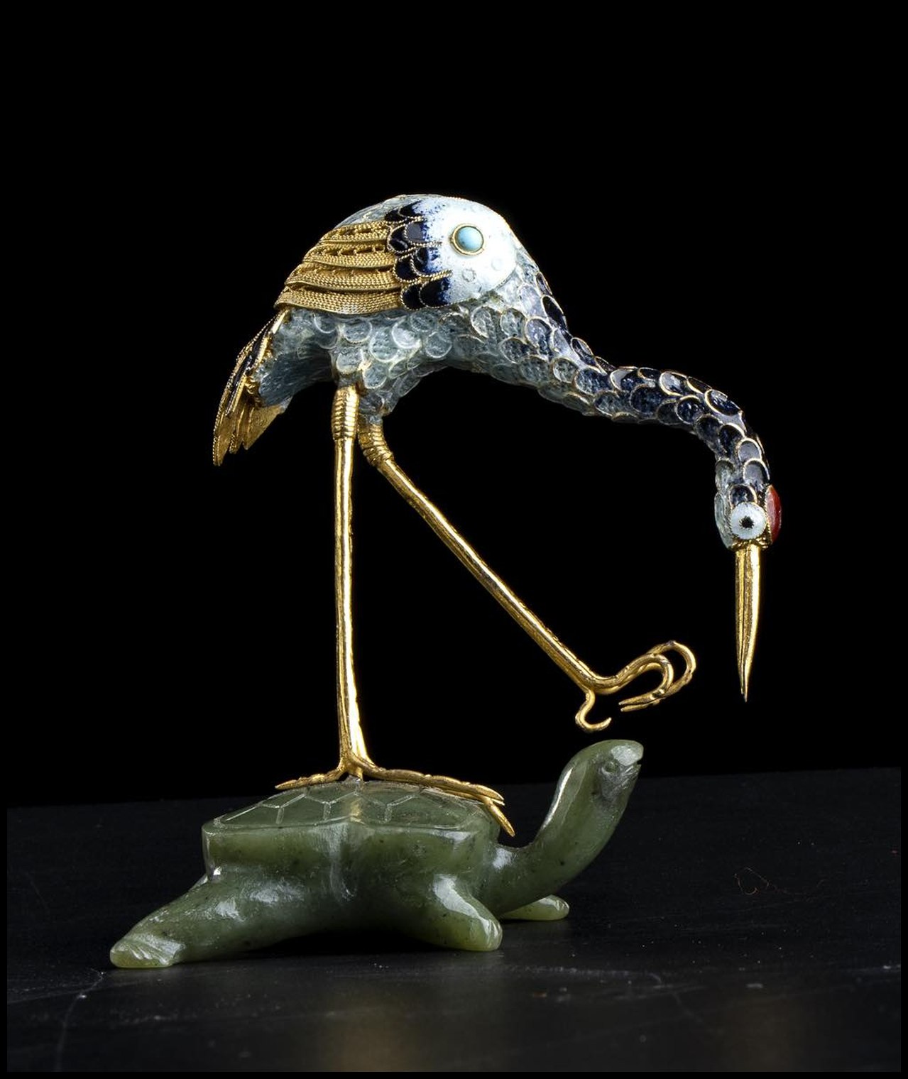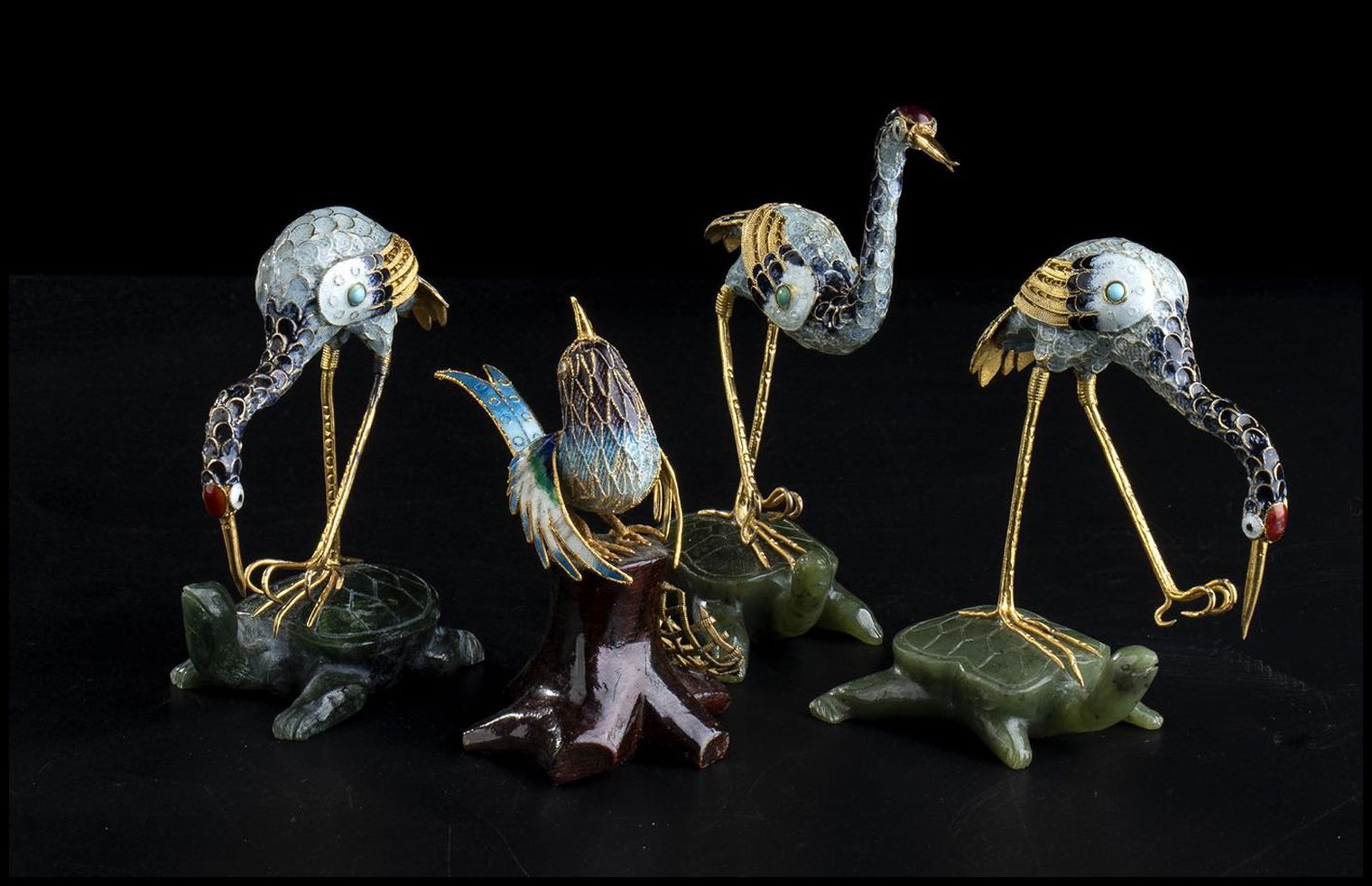 QUATTRO PICCOLE SCULTURE DI UCCELLI IN METALLO PARZIALMENTE DORATO E SMALTATO CON BASI IN PIETRA DURA E LEGNO Cina, XX secolo