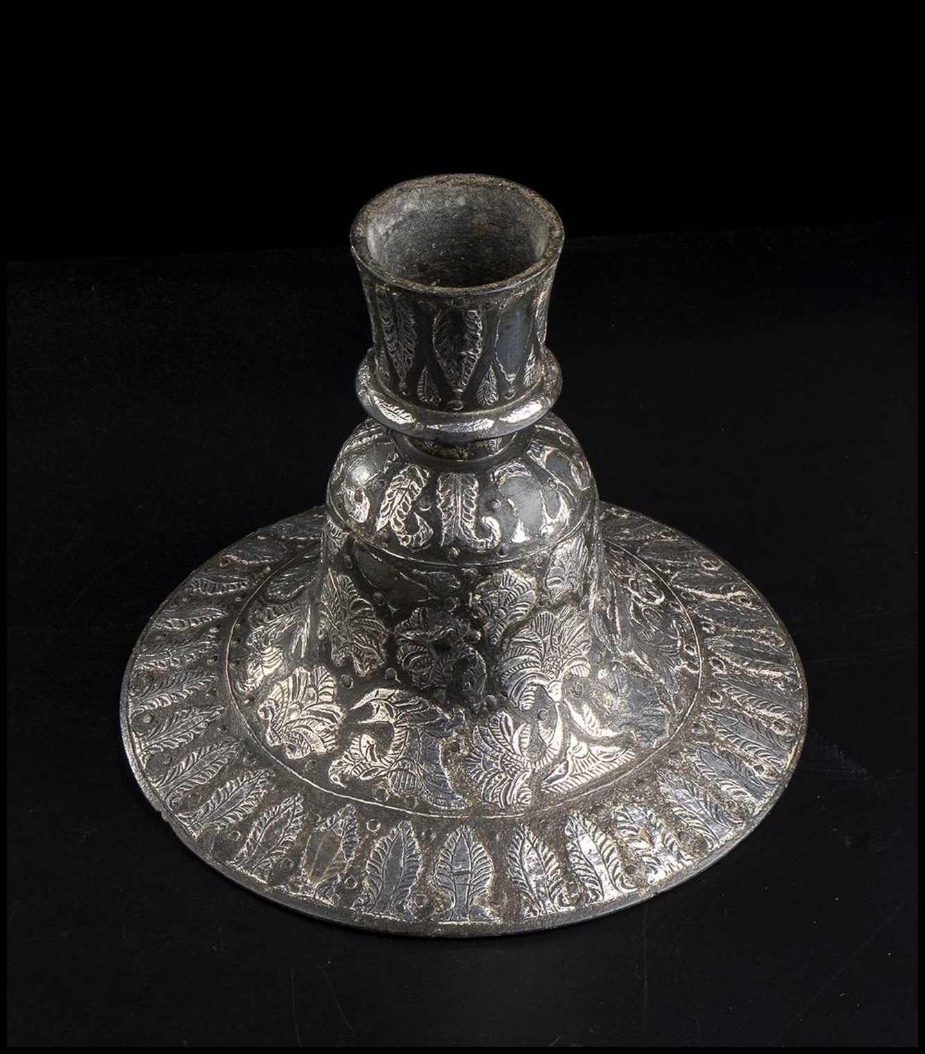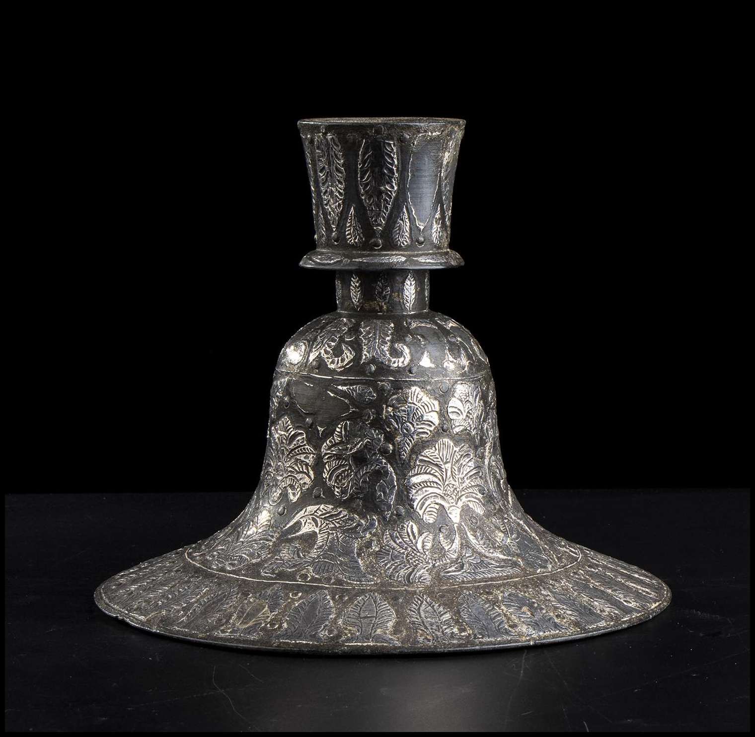 CANDELIERE IN METALLO CON APPLICAZIONI IN ARGENTO Area islamica, XIX secolo