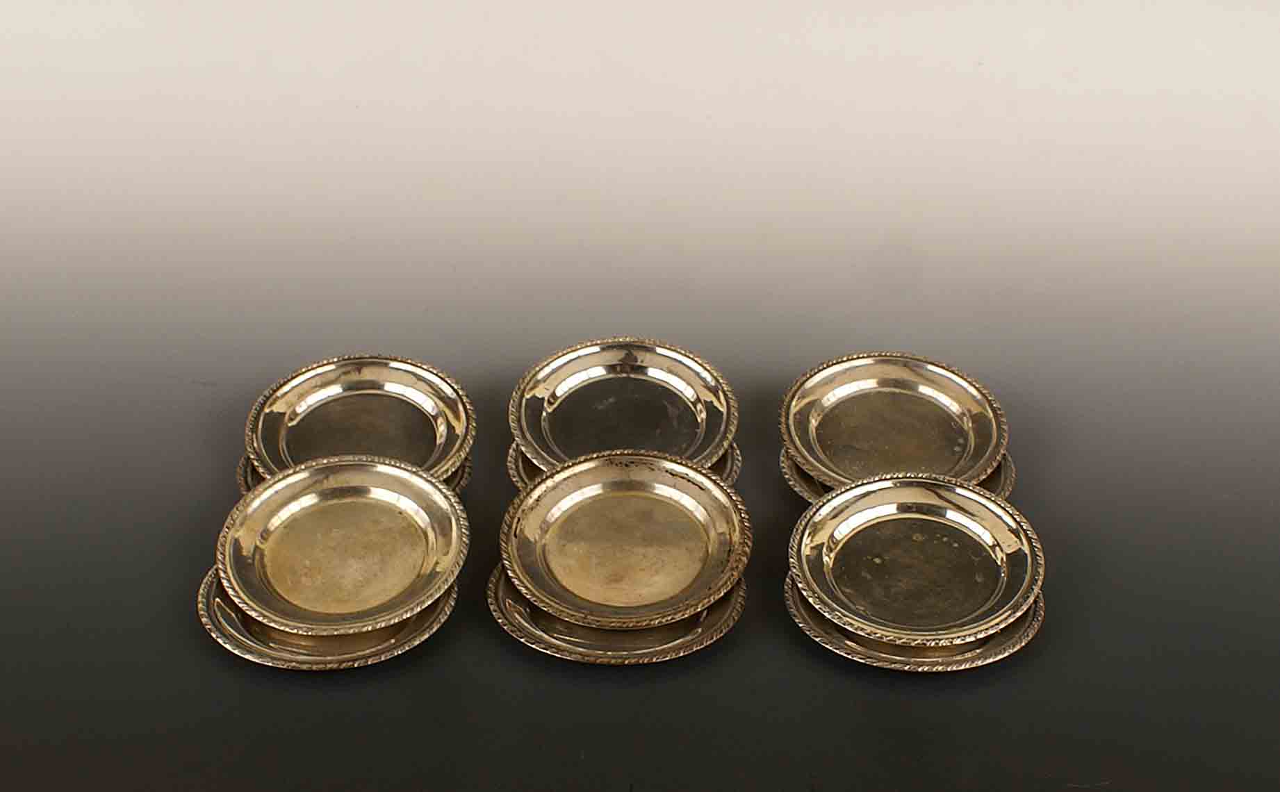 Dodici sottobicchieri in argento, d. cm. 9,5, gr. 340.