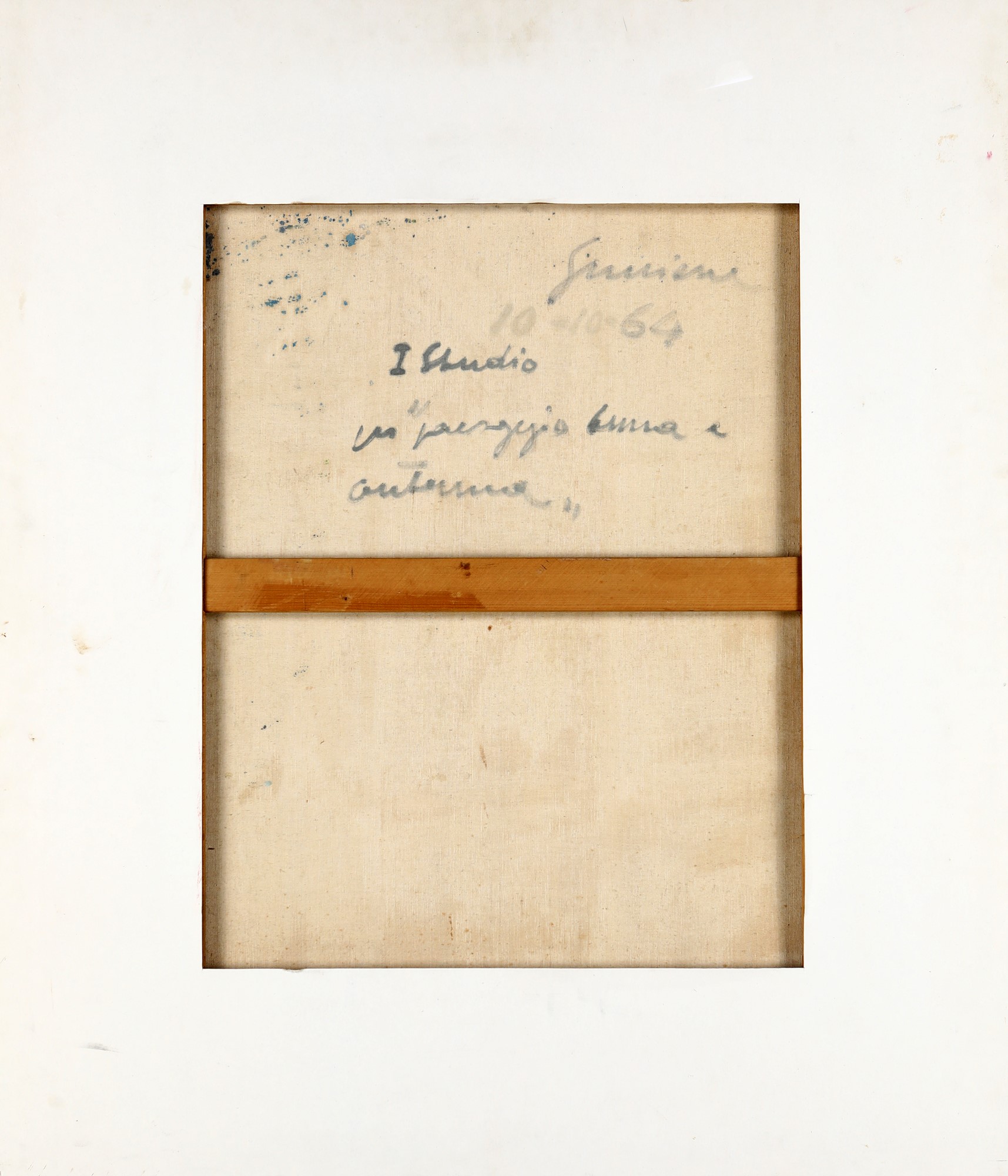 Firma, titolo e data in basso a sinistra "Guccione 964 studio per paesaggio con la luna". Firma e data in alto a destra "Guccione '64". Al verso reca firma, titolo e data "Guccione / 10-10-64 / I studio per paesaggio luna e antenna".