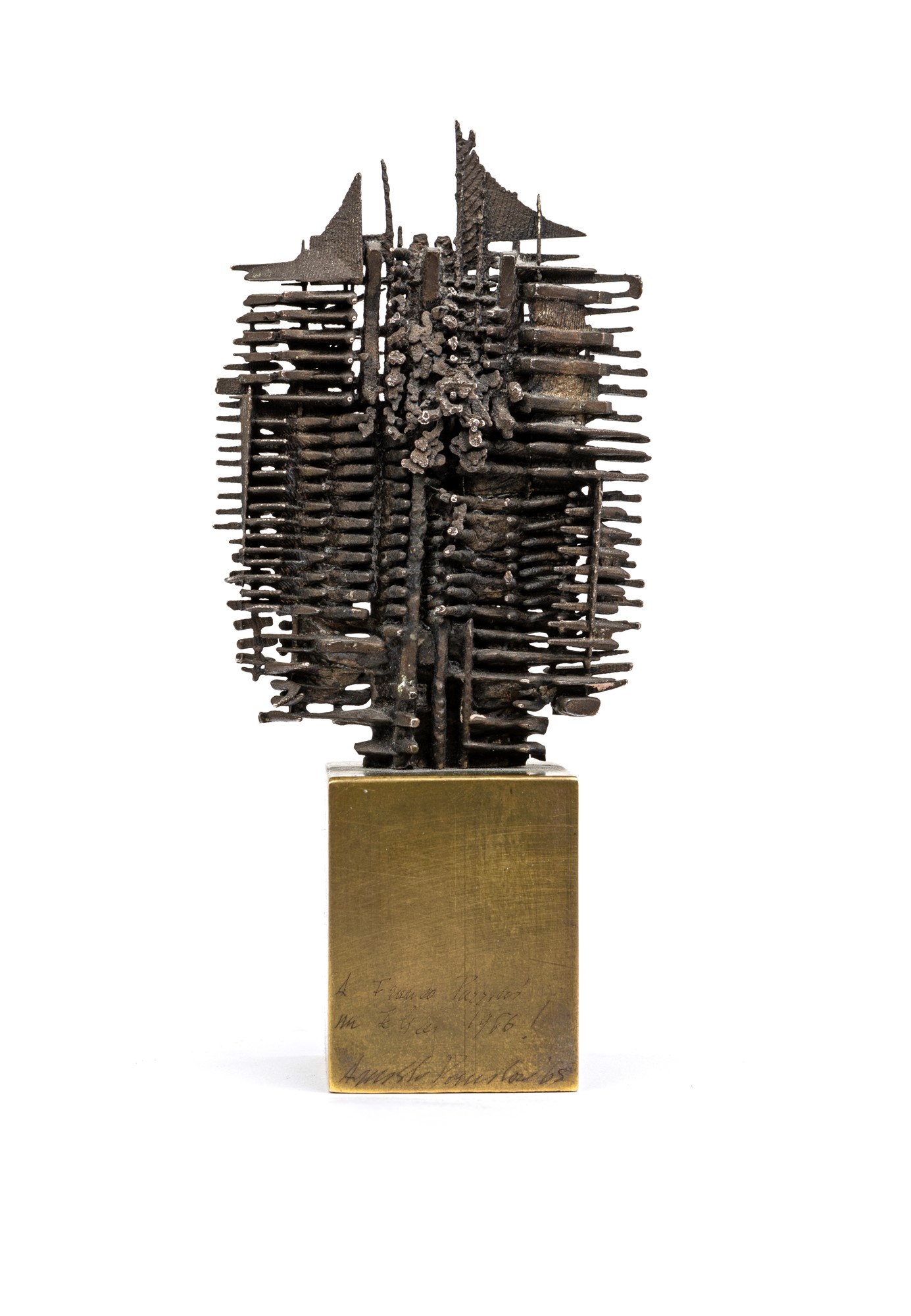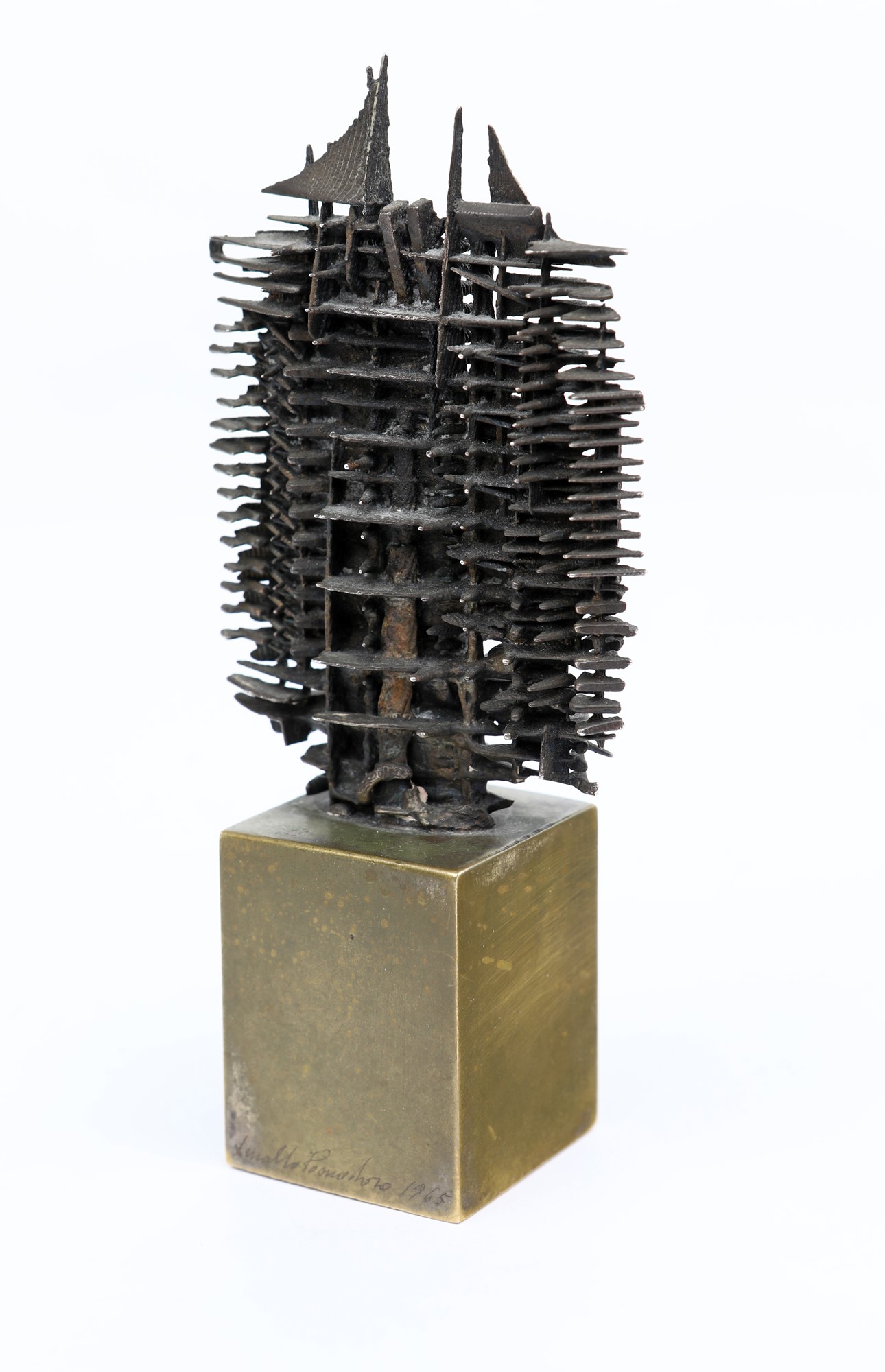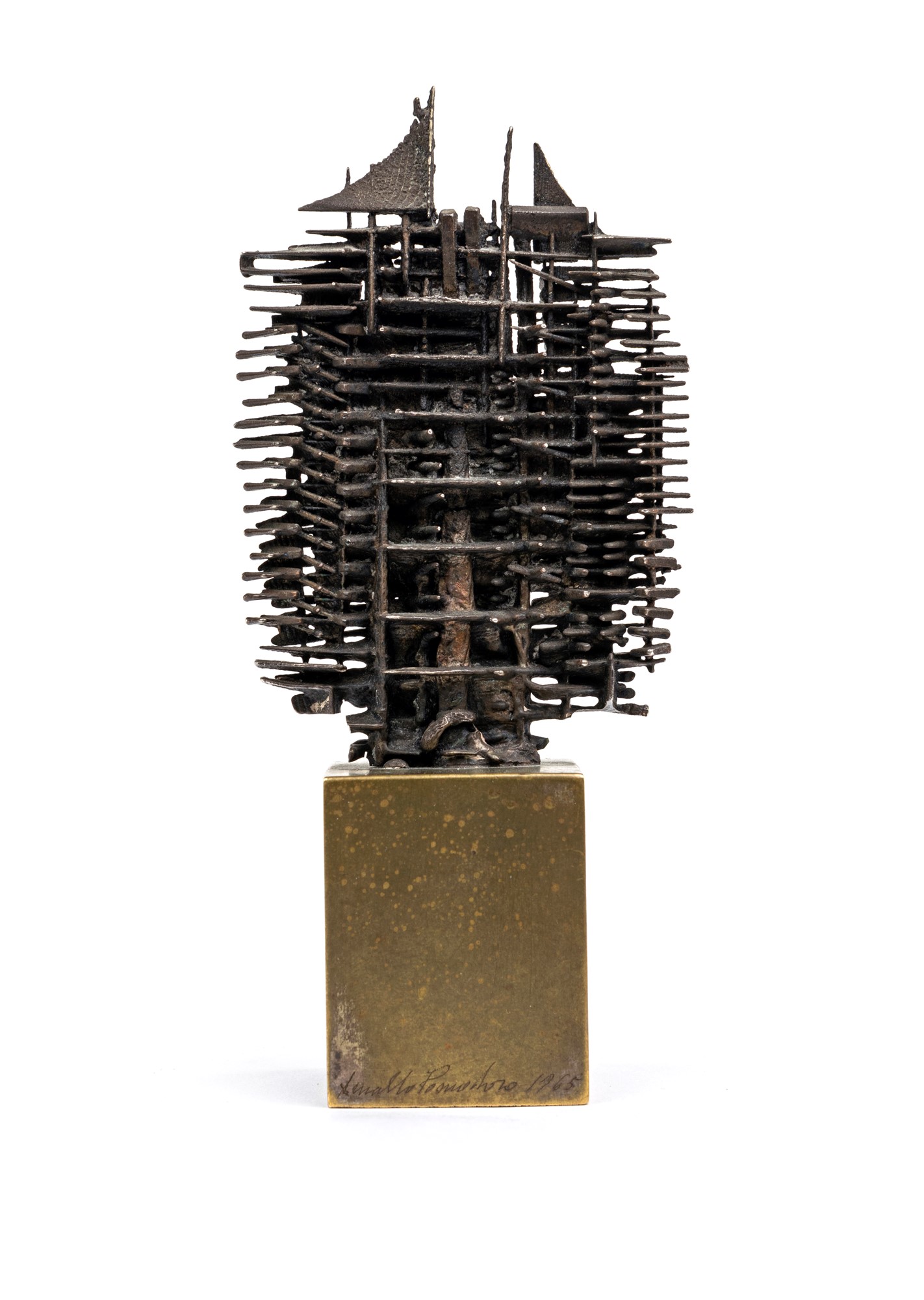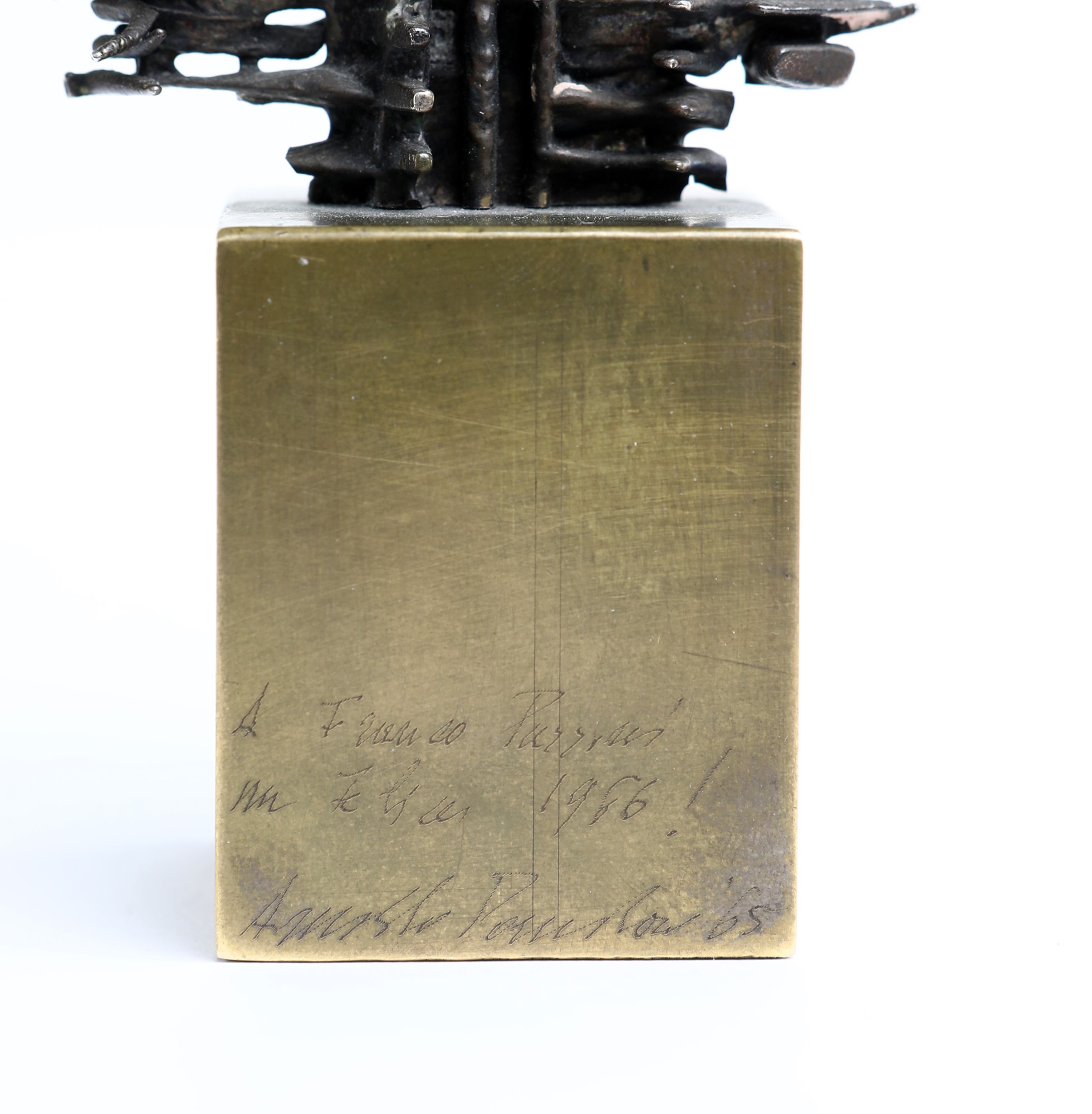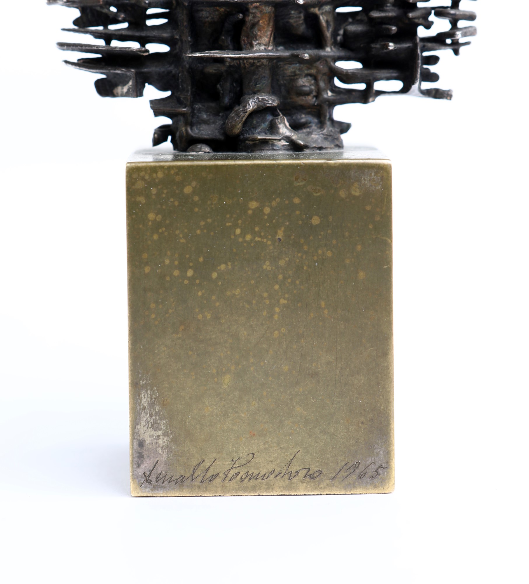Firma, data e dedica sulla base "Arnaldo Pomodoro 1965 / a Franco Passoni / un felice 1966 / Arnaldo Pomodoro '65". Esemplare unico