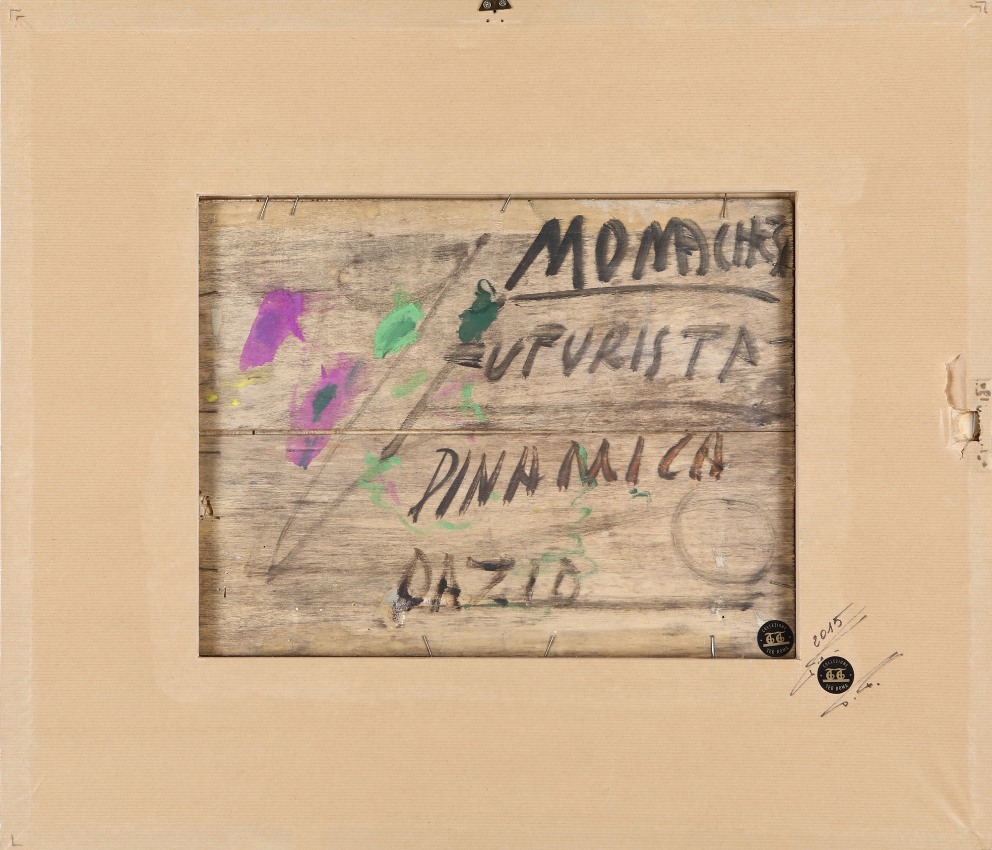 Firmato "Monachesi" su tutti e quattro i lati del dipinto. Al retro reca "Monachesi Futurista / Dinamica Dazio".