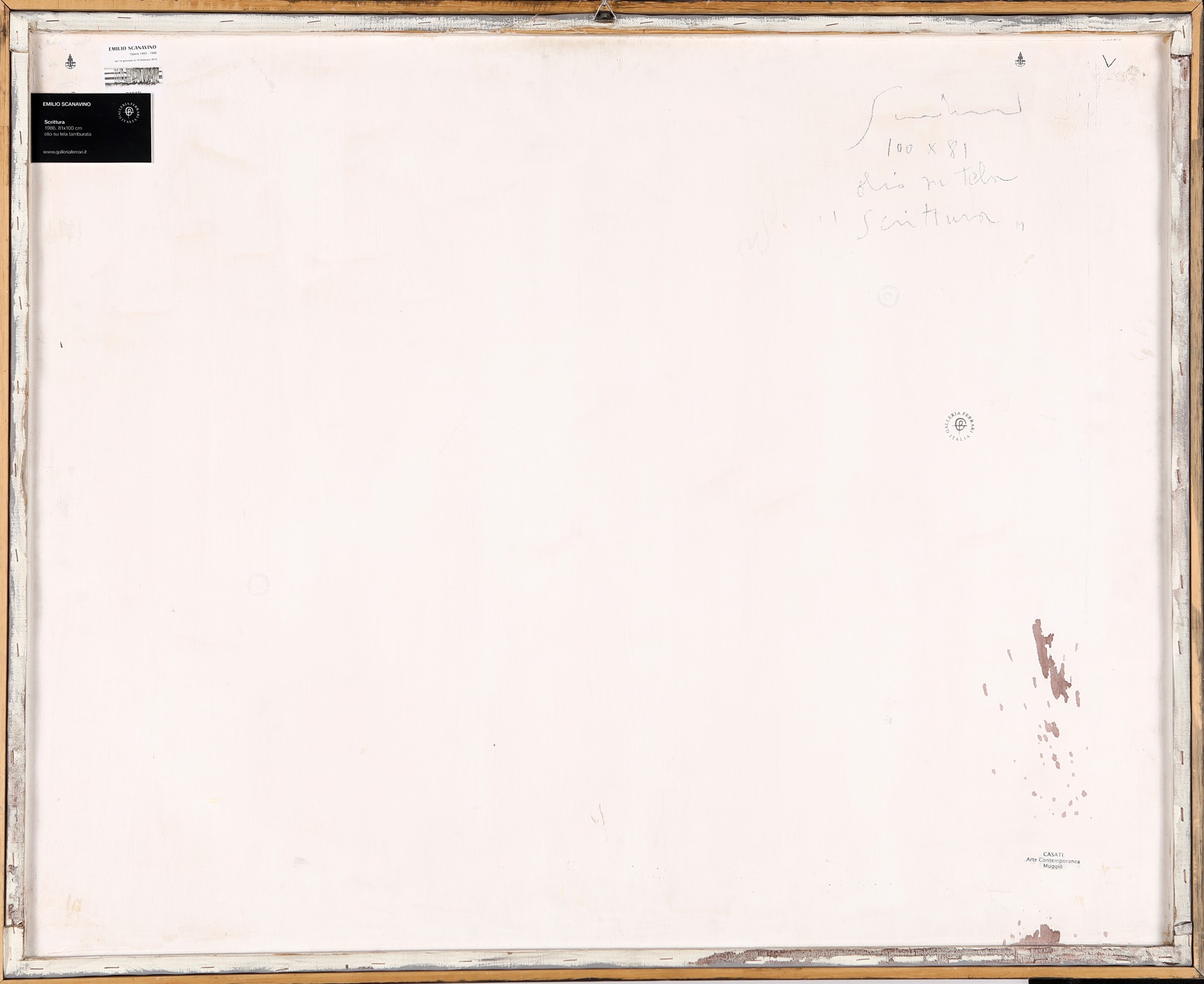 Firma in basso a destra "Scanavino". Al verso reca firma e titolo. Timbro ed etichetta Galleria Ferrari, Treviglio. Timbro ed etichetta Casa Arte Contemporanea, Muggiò