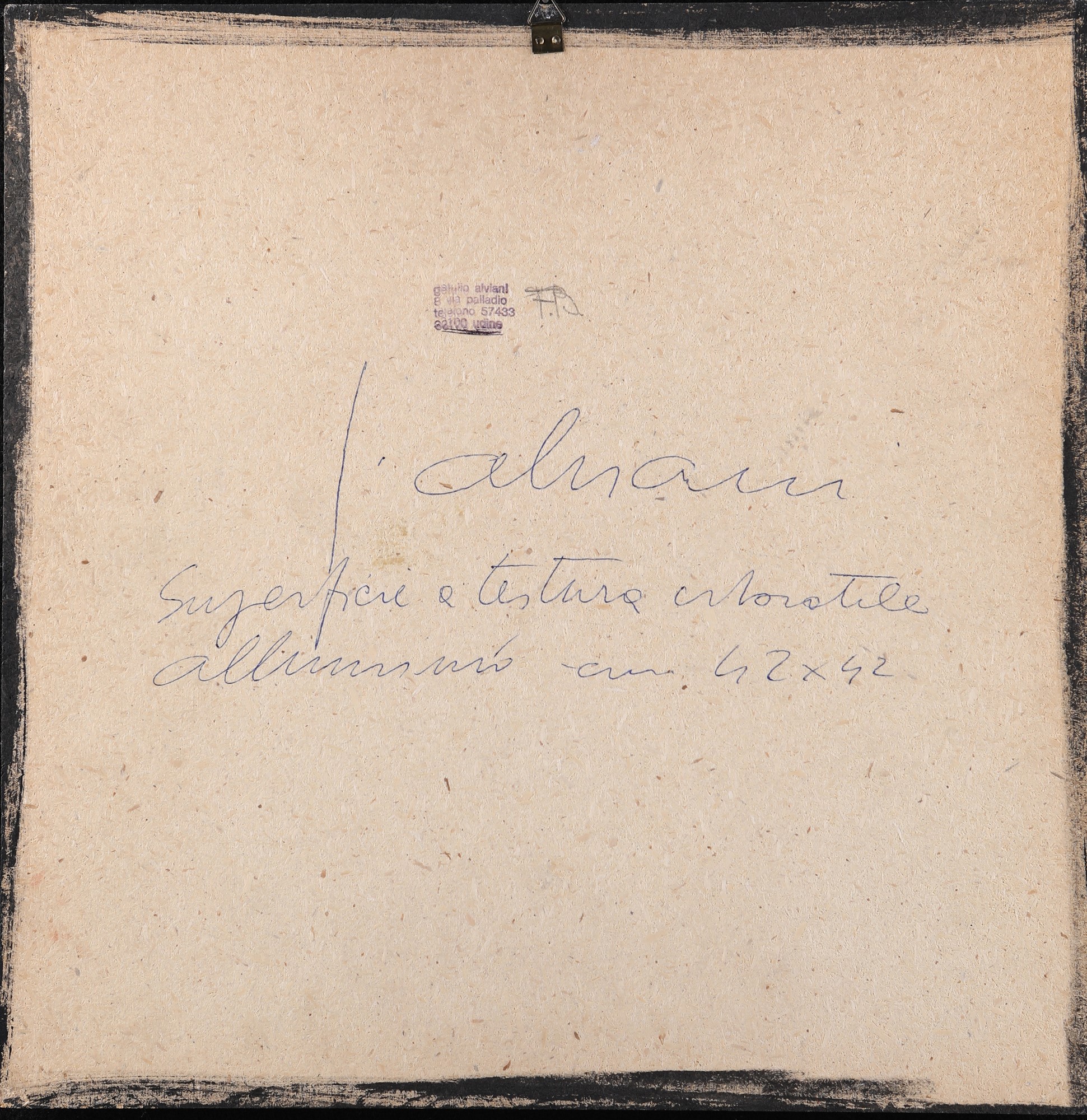 Firma, titolo, tecnica e misure al verso "G. Alviani, Superficie a testura vibratile, alluminio, cm 42x42". Timbro Getulio Alviani/ 8 via palladio / Udine
