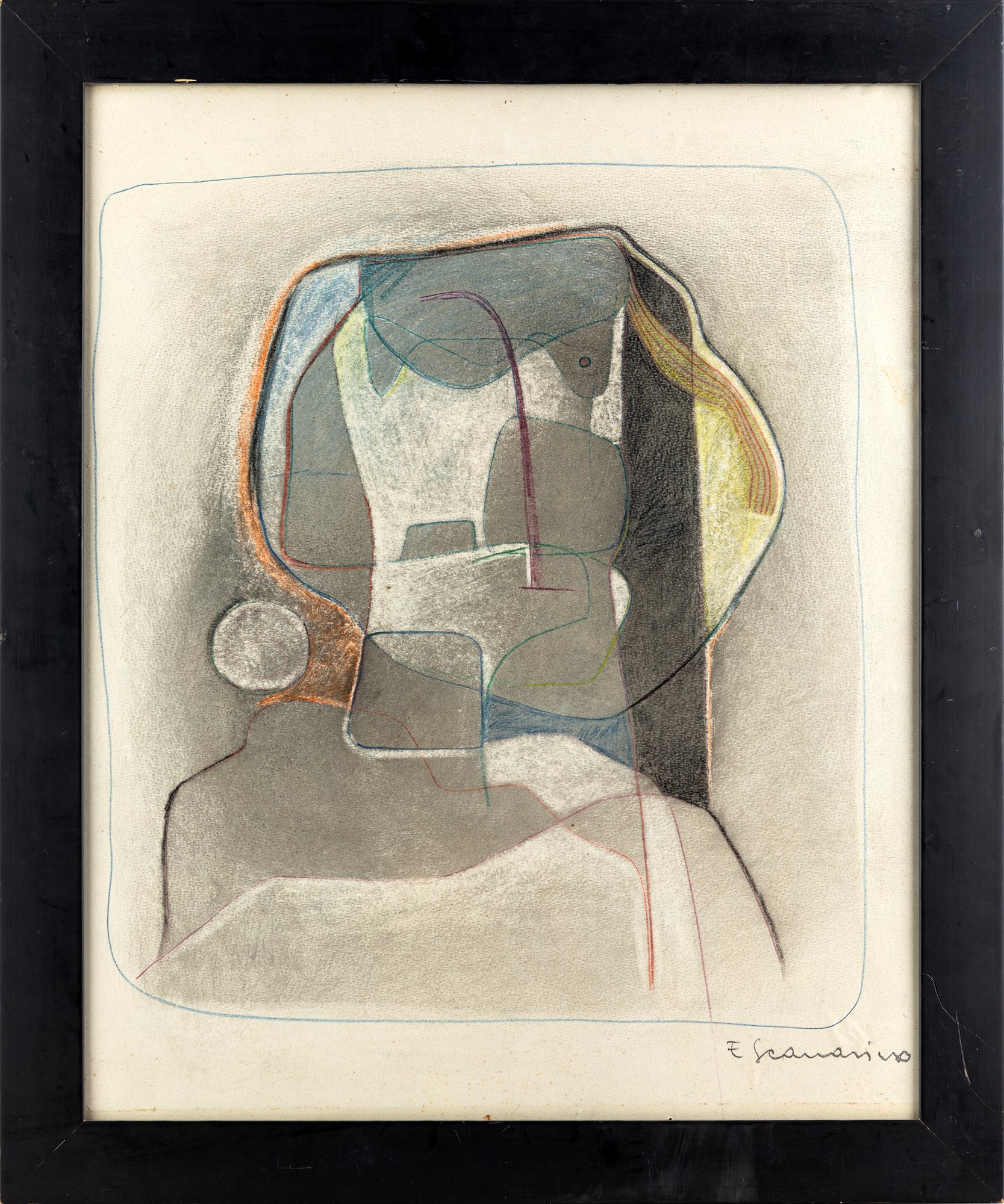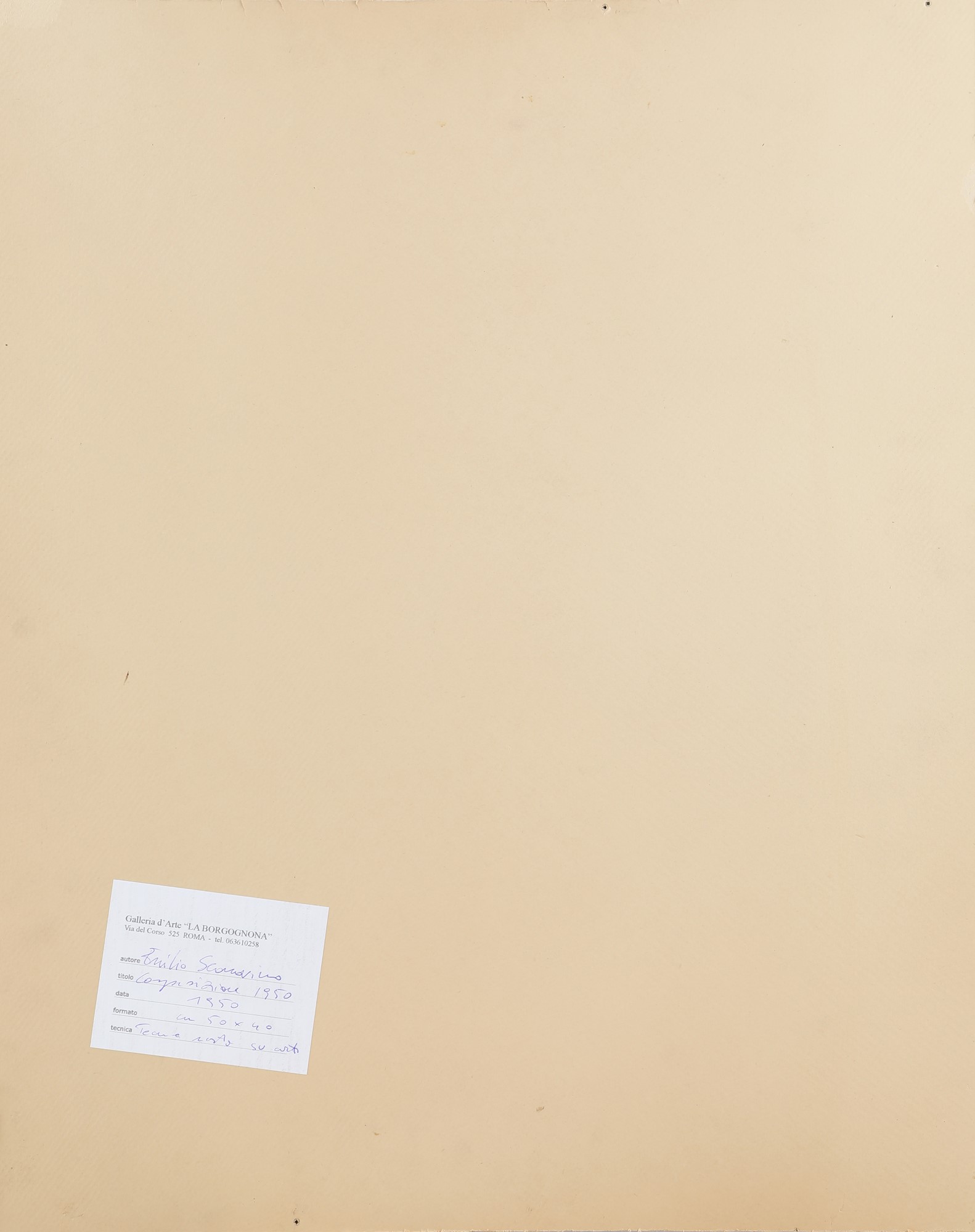 Firma in basso a destra "E.Scanavino". Al verso reca etichetta della Galleria La Borgognona, Roma.