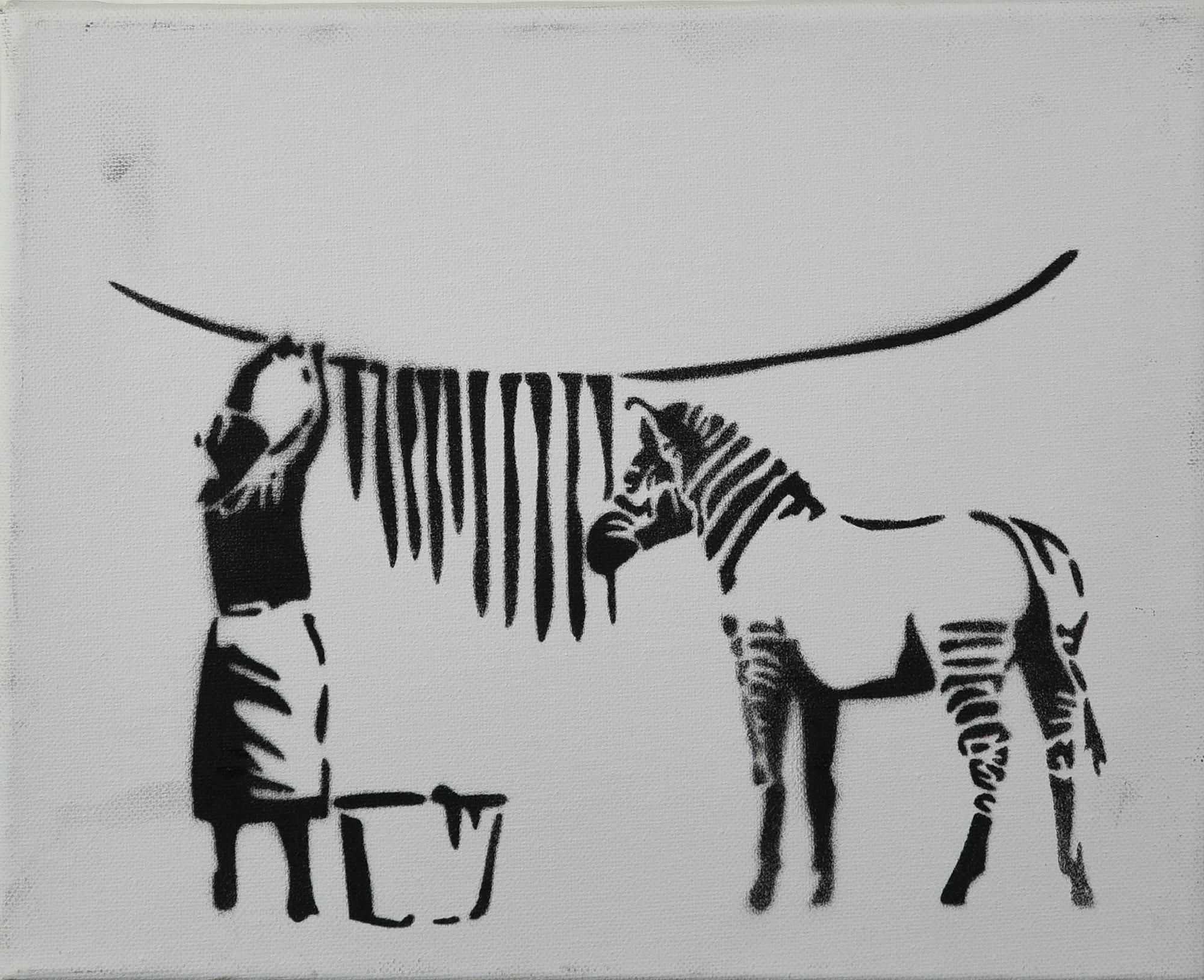 Banksy (1974) WASHING ZEBRA spray stencil su tela, cm 25x30; es. 12/15 firma...
