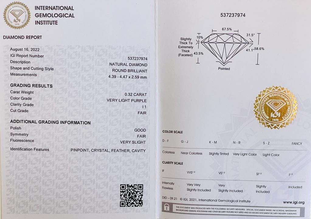 DIAMANTE 0,32 CT VIOLA MOLTO CHIARO PUREZZA I1 - TAGLIO BRILLANTE - CERTIFICATO IGI - AM20707-2